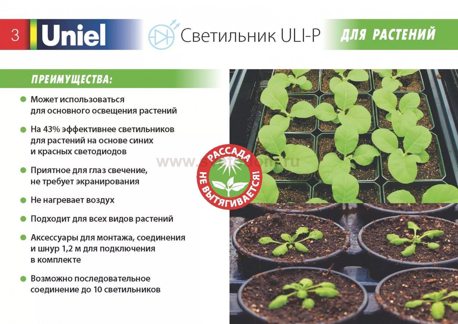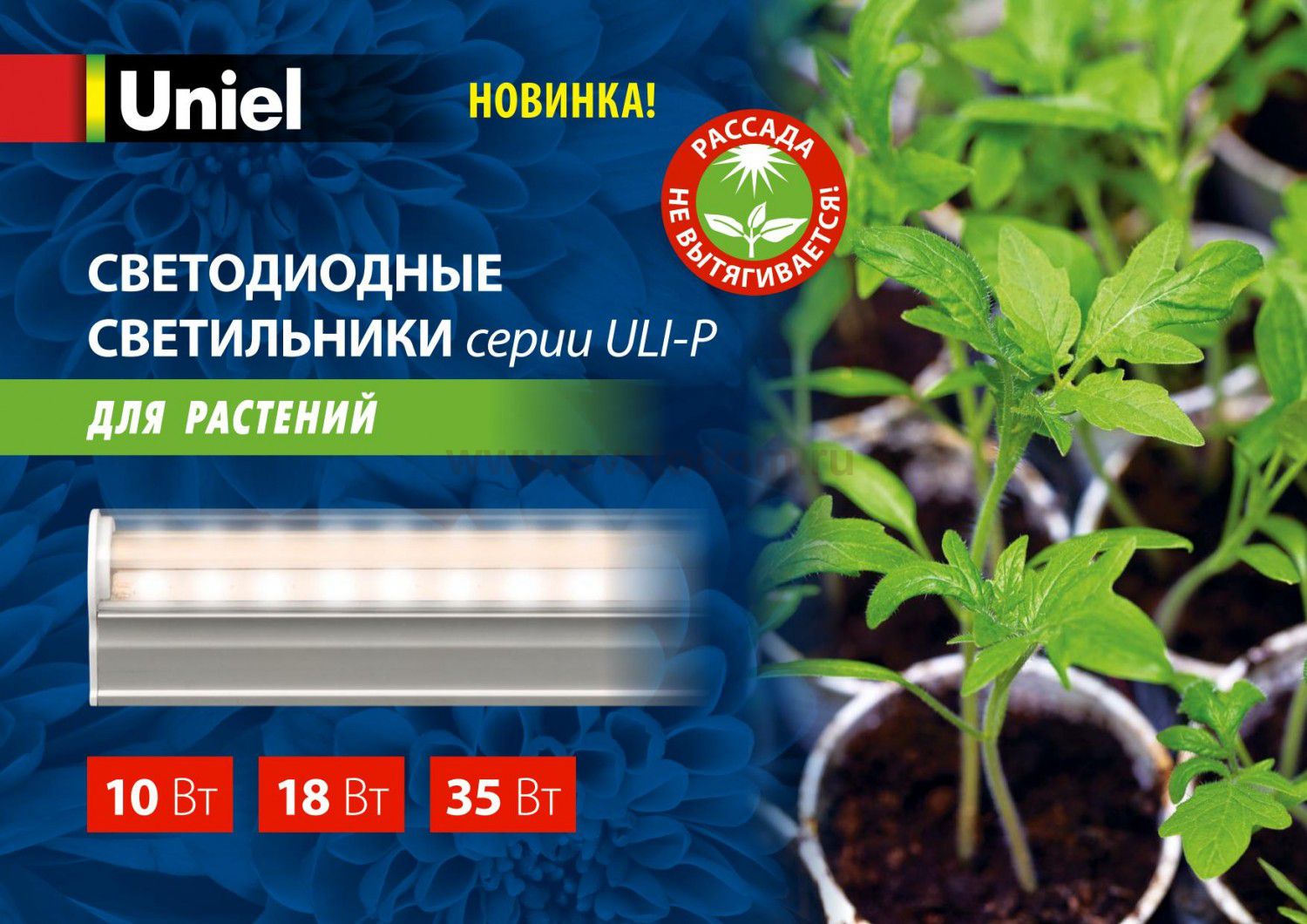 Светильники предназначены для ускорения роста и развития растений, рассады и плодов, а также для основного освещения растений. Освещение с помощью ULI-P позволяет растениям эффективно пройти полный цикл развития — от проращивания семян до плодоношения. Светильник ULI-P обладает уникальным спектральным составом света, повторяющим спектр, необходимый для фотосинтеза растений. Светильник может использоваться в жилых помещениях без экранирования, в отличие от люминесцентных и других светильников с сине-красным спектром, неприятным для глаз. Преимущества светильника серии ULI-P11: