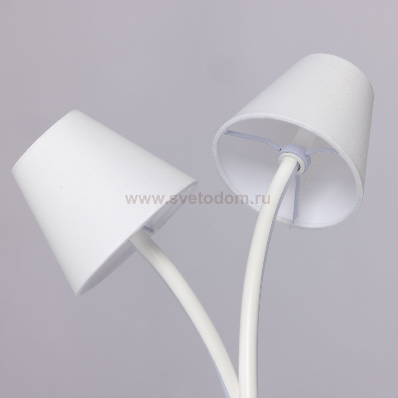 Металлическое основание настольной лампы окрашено в белый цвет. Корпус плафонов изогнутой формы выполнен из сплава алюминия с цинком и окрашен в цвет основания. Двухслойные абажуры состоят из текстиля белого цвета и термостойкого акрила с внутренней стороны. Абажуры прошиты. Светодиодные источники света закрыты белым силиконом. Комментарий