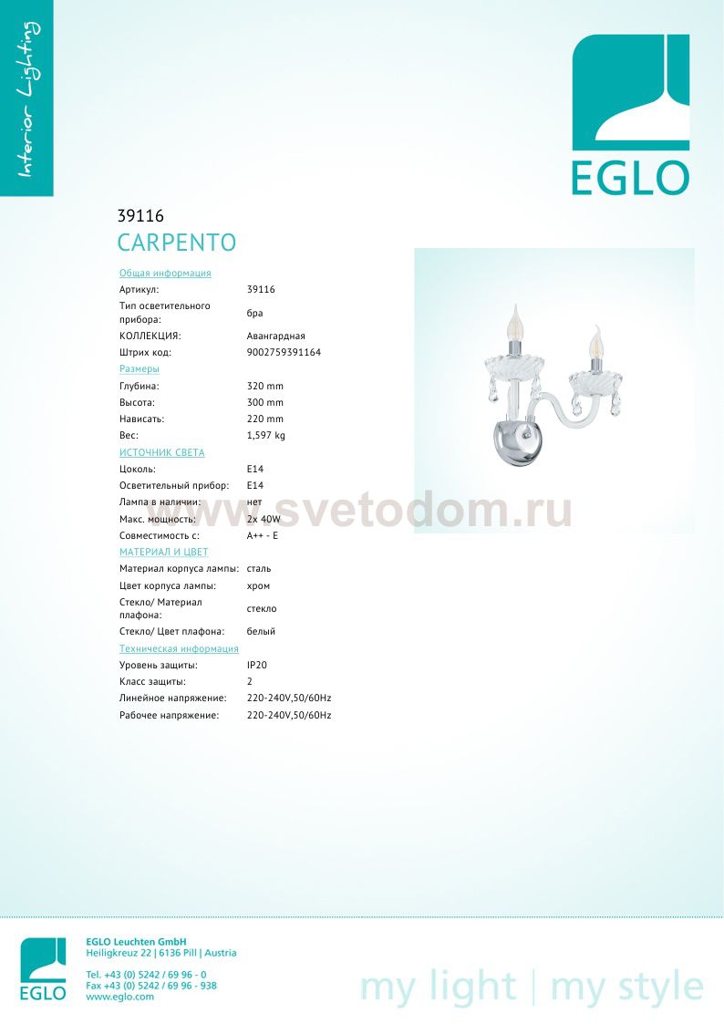 Светильник бра Eglo 39116 CARPENTO сделает Ваш интерьер современным, стильным и запоминающимся! Наиболее функционально и эстетически привлекательно модель будет смотреться в гостиной, зале, холле или другой комнате. А в комплекте с люстрой и торшером из этой же коллекции сделает интерьер по-дизайнерски профессиональным и законченным.