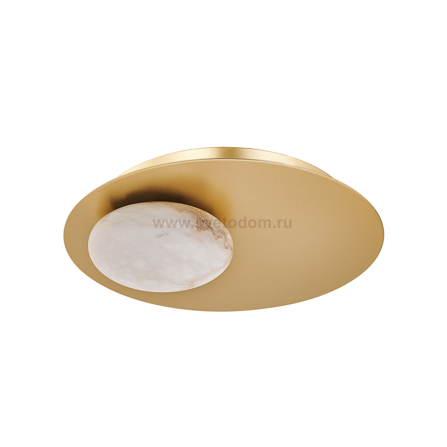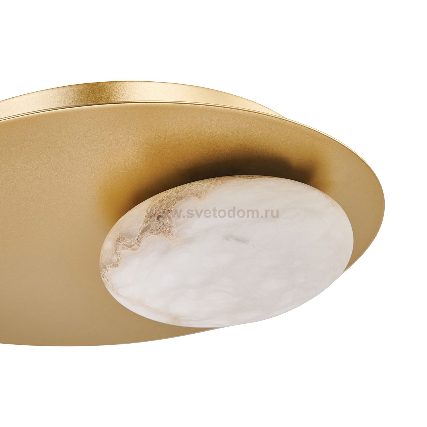 Каркас в виде золотого металлического диска, плафоны из натурального мрамора в форме отполированных эллипсов, встроенный LED-модуль. Серия