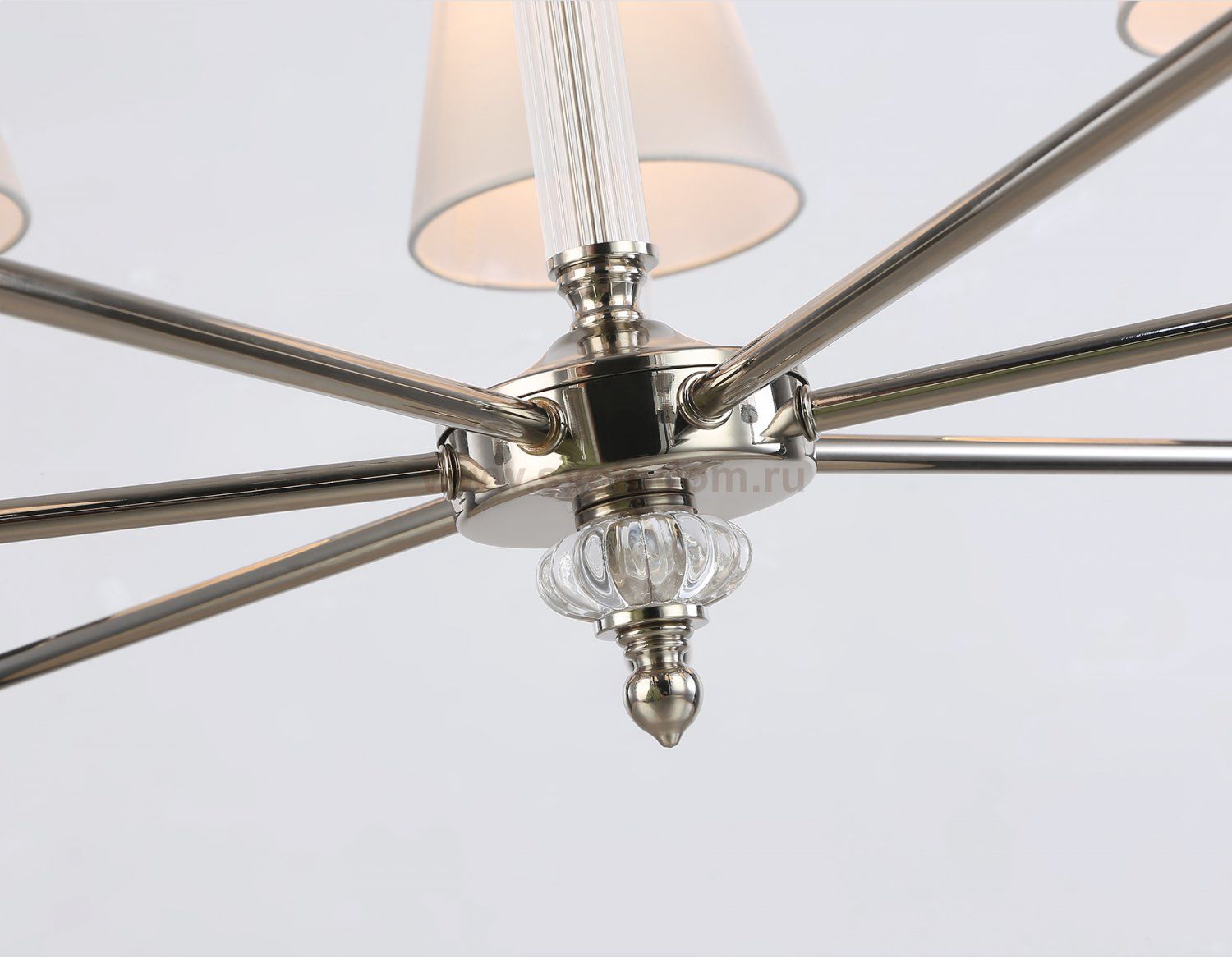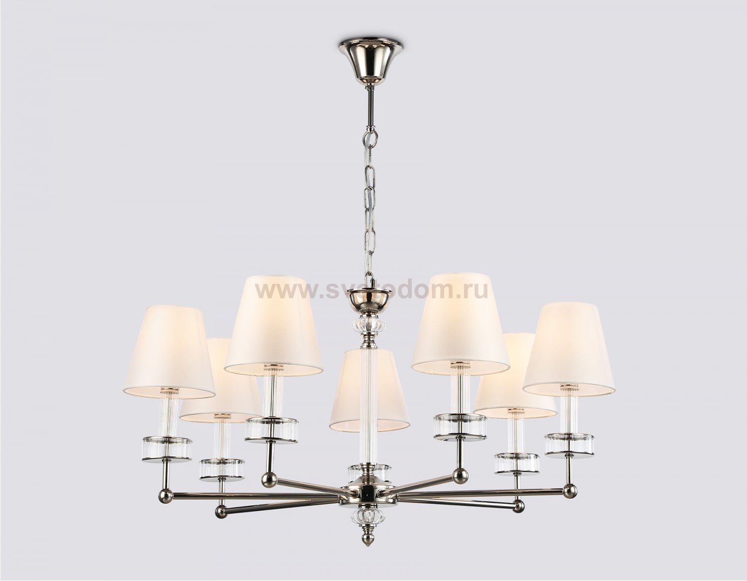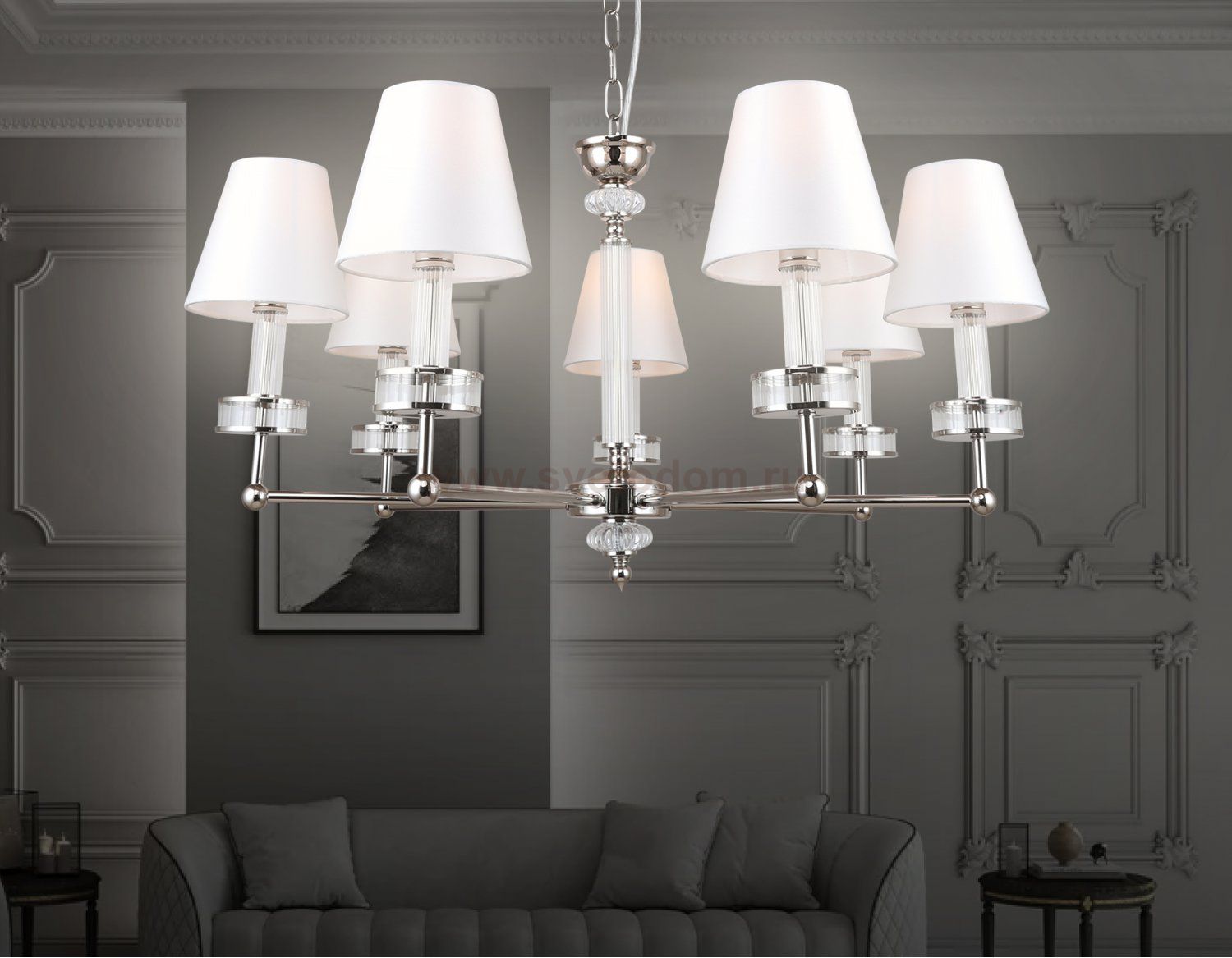 Подвесная люстра с абажурами и хрусталем из коллекции HIGH LIGHT. Модель LH71003 представлена в стиле неоклассика. Люстра выполнена из металла цвета никель, тканевых плафонов белого цвета и декорирована превосходным прозрачным хрусталем. Для данной модели подойдут лампы с цоколем Е14. Люстра будет прекрасным дополнением в любом помещении.