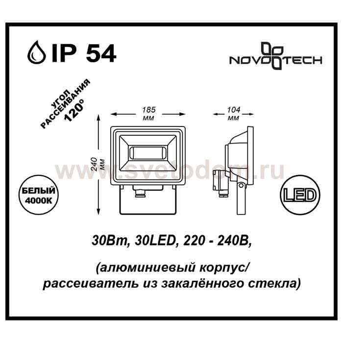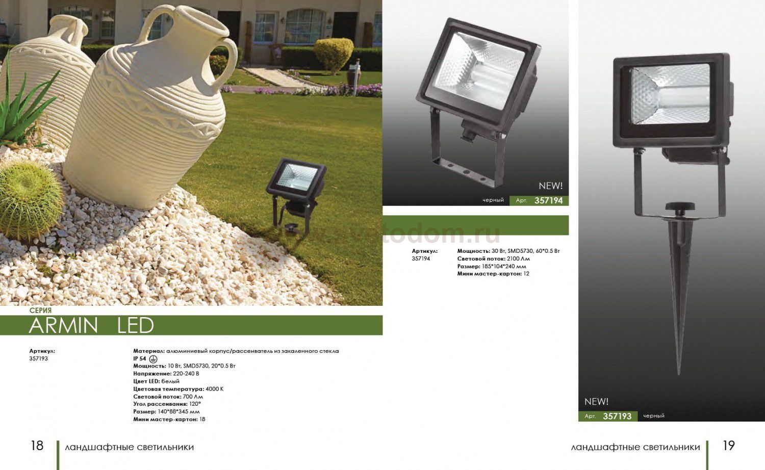 Уличный светодиодный прожектор модели Novotech 357194 из серии ARMIN отличается следующим качеством: Корпус светильника состоит из алюминия. Это металл, основными достоинствами которого являются — устойчивость к практически всем видам негативного воздействия окружающей среды, коррозии, небольшой вес, по сравнению с другими видами металла и экологическая безопасность материала. Рассеиватель сделан из закаленного стекла. Оно выдерживает температуру от -70 до 250С., а так же в 5-6 раз прочнее обычного. Экономичность (КПД порядка 90%), отсутствие токсичных элементов (не наносят вред здоровью, не требуют специальной утилизации), отсутствие ультрафиолетового излучения, пожаробезопасность (не нагреваются), морозостойкость, ударопрочность и устойчивость к вибрациям. Диапазон рабочих температур от -20 до +50 градусов Цельсия.