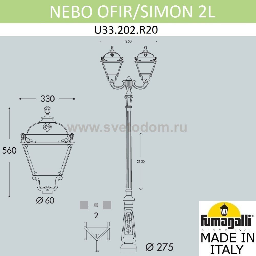 Касаемо артикула U33.202.R20.AXH27 важно знать - Парковый фонарь FUMAGALLI большого размера серии SIMON, модель NEBO OFIR/SIMON 2L. Парковый фонарь с 2 светильниками большого размера, на консолях OFIR среднего размера, установленных на классическом столбе NEBO высотой 2,5 м (+высота фонарей на кронштейнах). Изготовлены в Италии, по уникальным технологиям "FUMATECH" из современного композитного полимера RESIN. Этот материал в 5 раз прочнее металла, не ржавеет, не окисляется, не выгорает на солнце, его не нужно красить. Все светильники пыле-влаго защищены по стандарту IP55 (Пылезащищенные, защита от водяных струй с любого направления). Рассеиватель выполнен из антивандального, не мутнеющего и не горючего PMMA (ПолиМетилМетаАкрилат). Срок службы светильника - не менее 20 лет. Температура использования от -60 до +90. В серии SIMON есть садовые фонари в настенном (OFIR/SIMON, MIRRA/SIMON) подвесном (SICHEM/SIMON) и наземном исполнении (IAFAET.R/SIMON, ALOE.R/SIMON, ARTU/SIMON, GIGI/SIMON, RICU/SIMON, NEBO/OFIR/SIMON 1L, NEBO/OFIR/ANNA 2L, TABOR/ADAM/SIMON 3L) со столбами разной высоты, с разным количеством и конфигурацией голов. Консоли настенных фонарей и кронштейны светильников на столбах освещения могут устанавливаться в положение вверх и вниз. Столбы выше 150 см имеют в основе мощную стальную трубу с двойной оцинковкой. При заказе требуется выбрать цвет корпуса, цвет плафона и тип патрона (Е-27 или LED GX-53). Возможен светодиодный вариант. По стилю и дизайну серия уличных светильников SIMON похожа на светильники среднего размера серии CEFA. По размеру относится к большим парковым светильникам как серия NOEMI и GLOBE 400.
