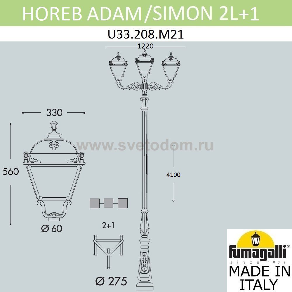 Касаемо артикула U33.208.M21.AXH27 важно знать - Парковый фонарь FUMAGALLI большого размера серии SIMON, модель HOREB ADAM/SIMON 2L+1. Парковый фонарь с 2 светильниками большого размера, на консолях ADAM большого размера, плюс 1 венчающий светильник, установленные на классическом столбе HOREB высотой 3,5 м (+высота фонарей на кронштейнах). Изготовлены в Италии, по уникальным технологиям "FUMATECH" из современного композитного полимера RESIN. Этот материал в 5 раз прочнее металла, не ржавеет, не окисляется, не выгорает на солнце, его не нужно красить. Все светильники пыле-влаго защищены по стандарту IP55 (Пылезащищенные, защита от водяных струй с любого направления). Рассеиватель выполнен из антивандального, не мутнеющего и не горючего PMMA (ПолиМетилМетаАкрилат). Срок службы светильника - не менее 20 лет. Температура использования от -60 до +90. В серии SIMON есть садовые фонари в настенном (OFIR/SIMON, MIRRA/SIMON) подвесном (SICHEM/SIMON) и наземном исполнении (IAFAET.R/SIMON, ALOE.R/SIMON, ARTU/SIMON, GIGI/SIMON, RICU/SIMON, NEBO/OFIR/SIMON 1L, NEBO/OFIR/ANNA 2L, TABOR/ADAM/SIMON 3L) со столбами разной высоты, с разным количеством и конфигурацией голов. Консоли настенных фонарей и кронштейны светильников на столбах освещения могут устанавливаться в положение вверх и вниз. Столбы выше 150 см имеют в основе мощную стальную трубу с двойной оцинковкой. При заказе требуется выбрать цвет корпуса, цвет плафона и тип патрона (Е-27 или LED GX-53). Возможен светодиодный вариант. По стилю и дизайну серия уличных светильников SIMON похожа на светильники среднего размера серии CEFA. По размеру относится к большим парковым светильникам как серия NOEMI и GLOBE 400.