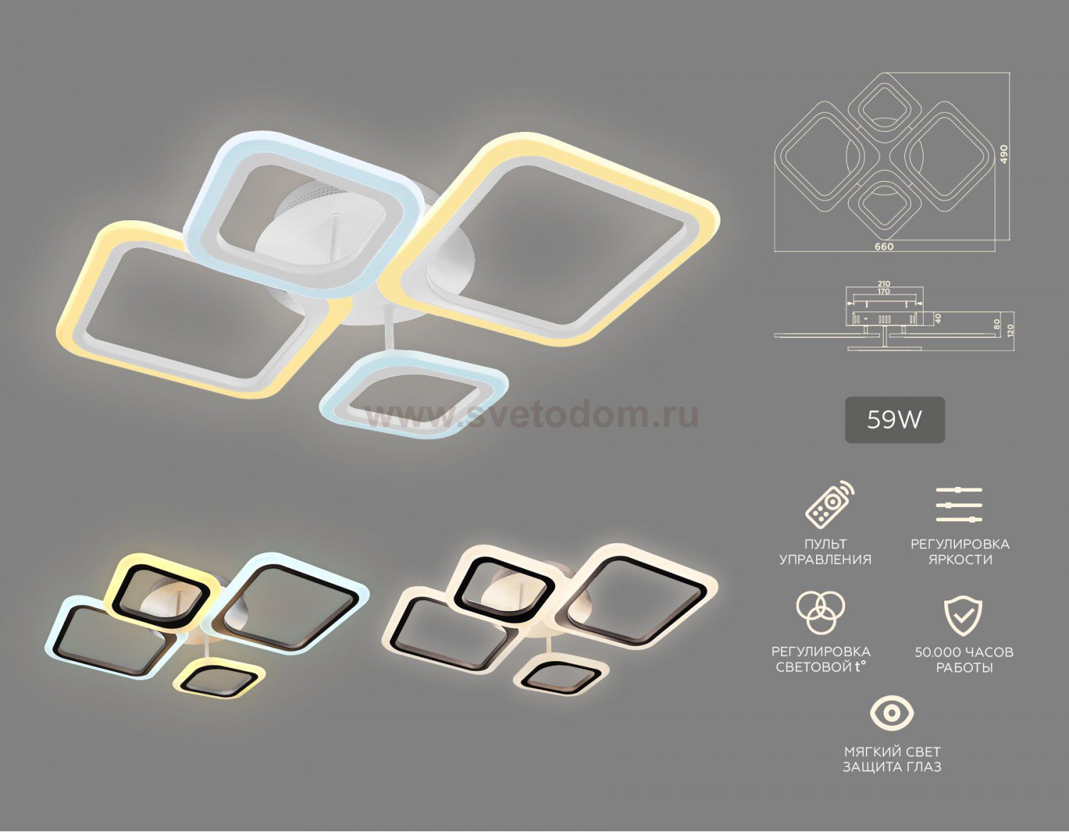 Современный потолочный светодиодный светильник, коллекция ACRYLICA. Модель FA4382 представлена в современном стиле Неоклассика. Светильник выполнен в белом цвете, квадратной формы, состоит из 4 акриловых плафонов на металлическом каркасе. Эта модель оснащена встроенными светодиодами, благодаря чему вы забудете о замене дополнительных ламп. Так же с помощью инфракрасного пульта вы сможете регулировать цветовую температуру, яркость освещения и ночной режим. Данная модель подходит для натяжных потолков и будет прекрасным дополнением в любом помещении.