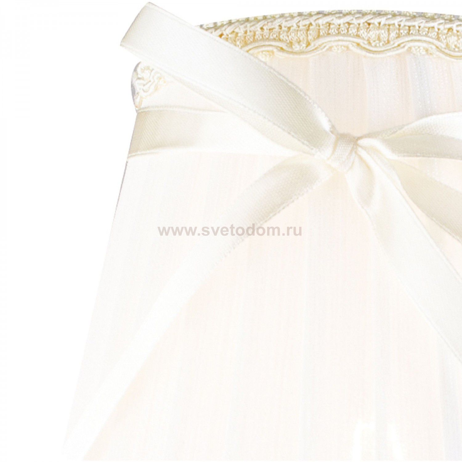 каркас окрашен в белый цвет с золотой патиной, абажур из ткани цвета слоновой кости украшен тесьмой с золотистым узором и белой атласной лентой, хрустальные подвески высшего качества Материал плафона