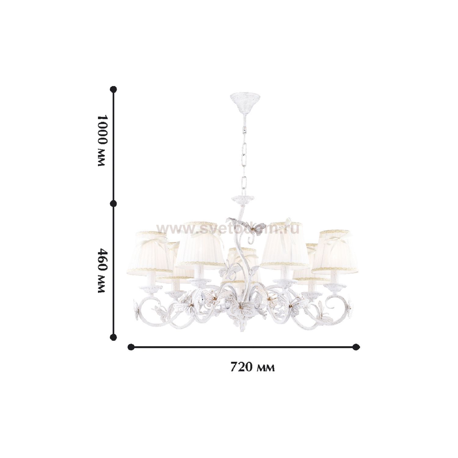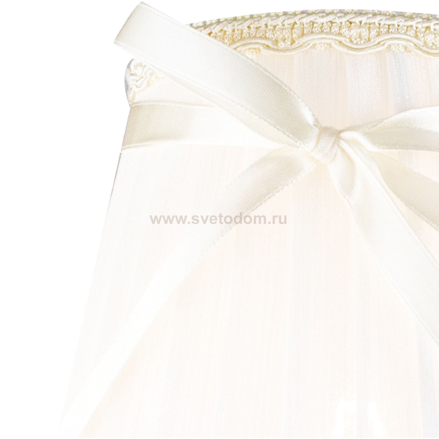 каркас окрашен в белый цвет с золотой патиной, абажур из ткани цвета слоновой кости украшен тесьмой с золотистым узором и белой атласной лентой, хрустальные подвески высшего качества Штрих-код