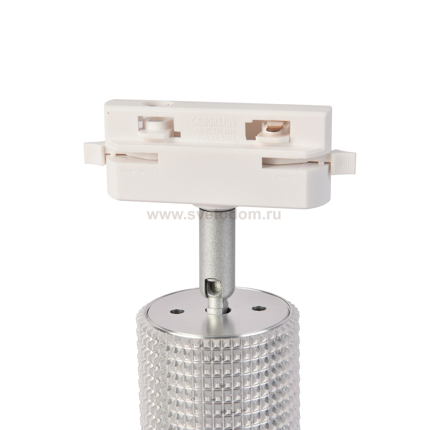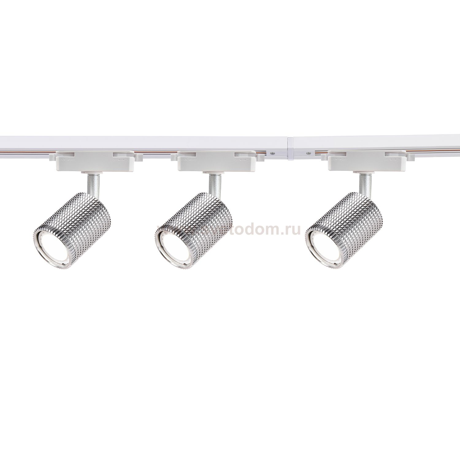 каркас цвета серебра, в комплект трековой системы входят: 3 спота, шинопровод (2х1м) и коннектор, угол поворота до 170°, лампу GU10 можно менять Серия