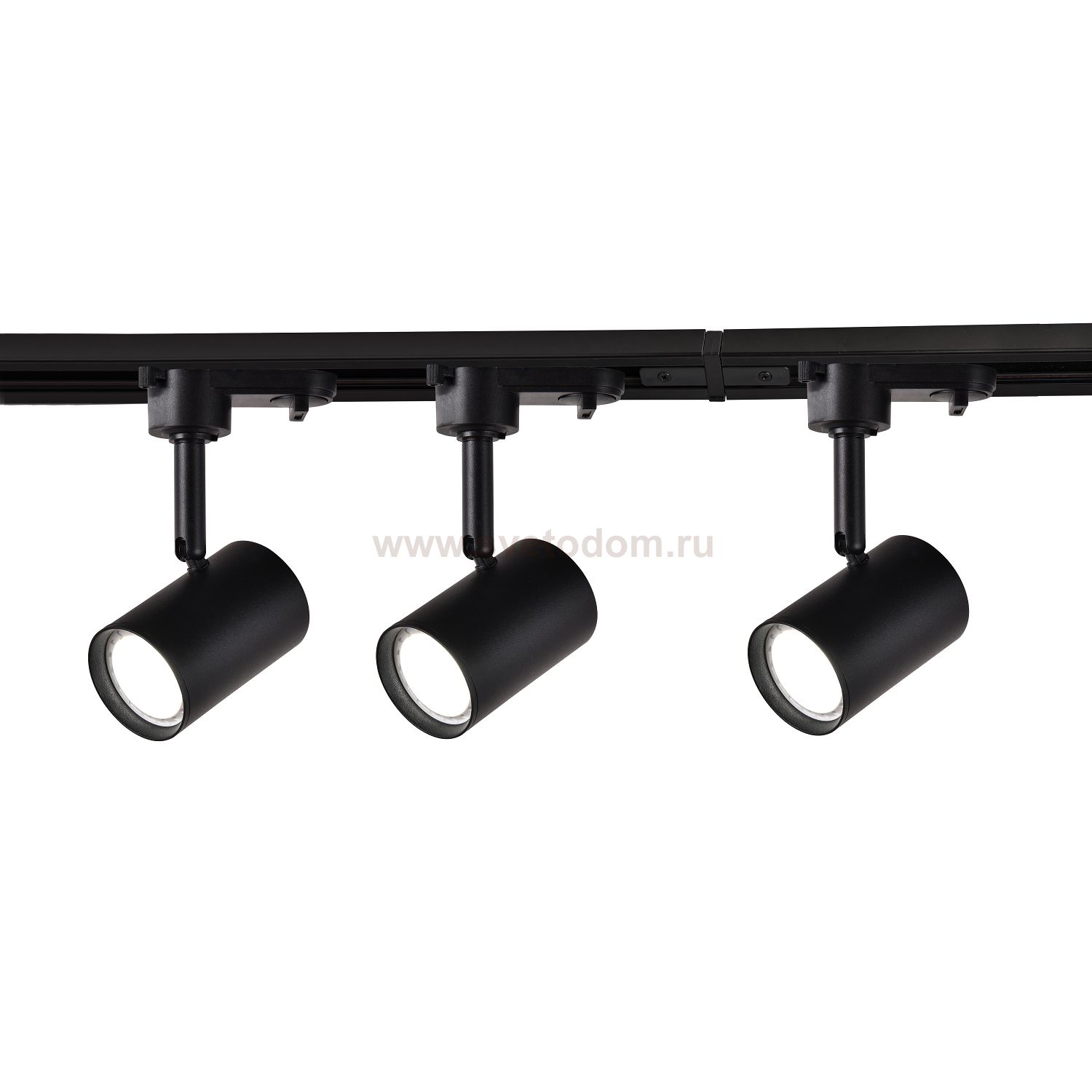 каркас черного цвета, в комплект трековой системы входят: 3 спота, шинопровод (2х1м) и коннектор, угол поворота до 170°, лампу GU10 можно менять Серия