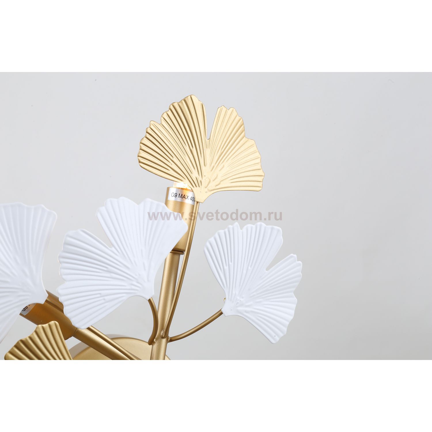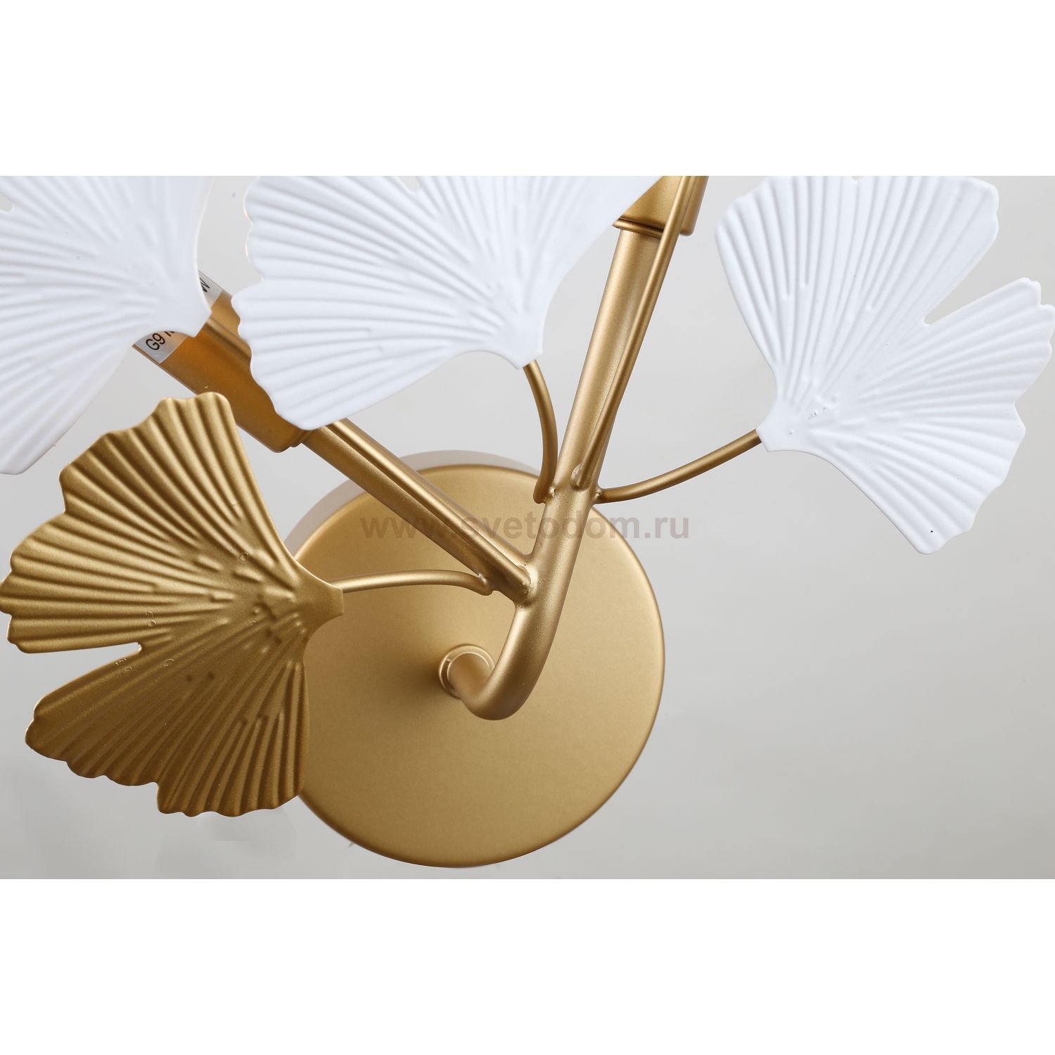 каркас цвета окрашенное золото, декор в виде листьев Гинкоа в белом и золотом цвете, лампы можно менять Декор