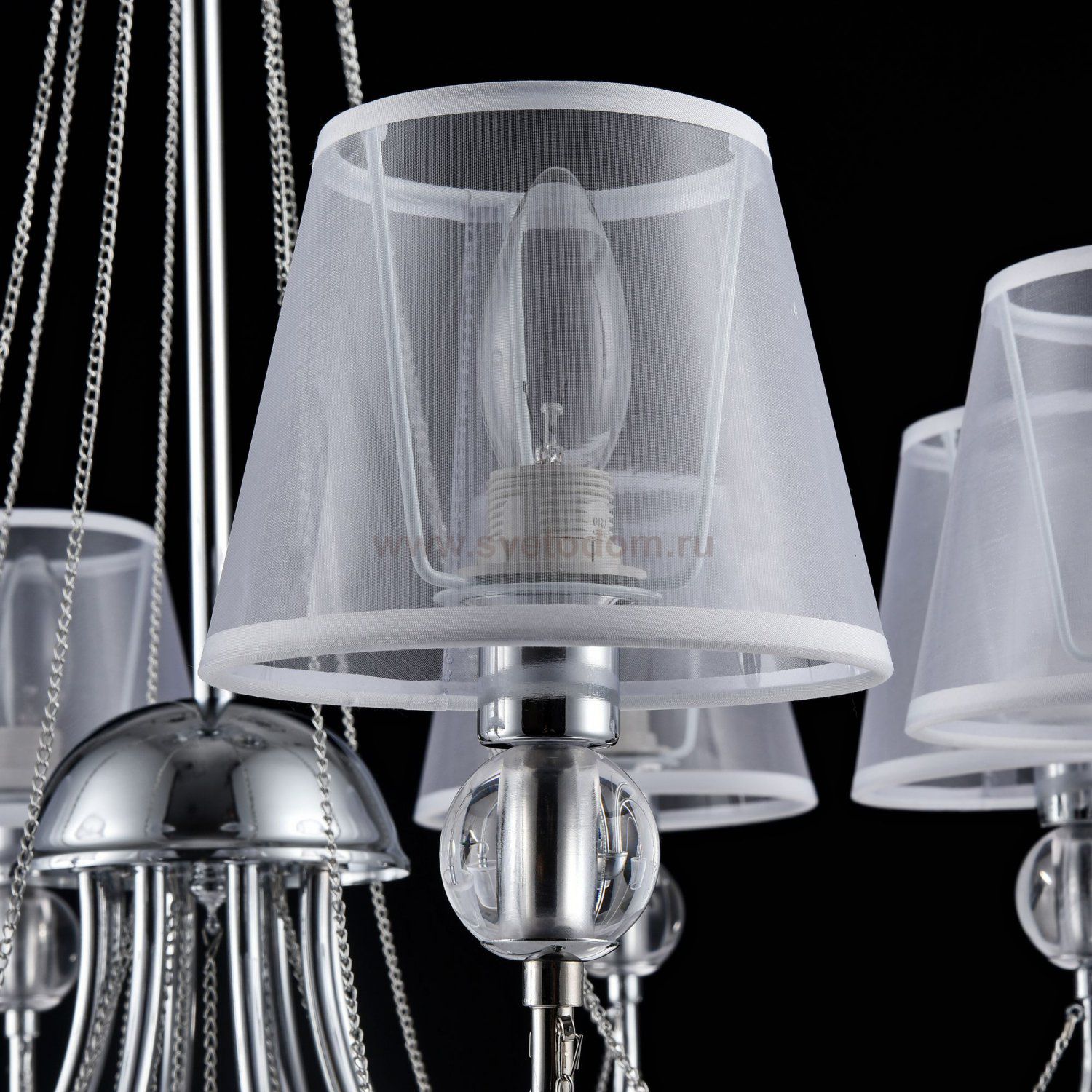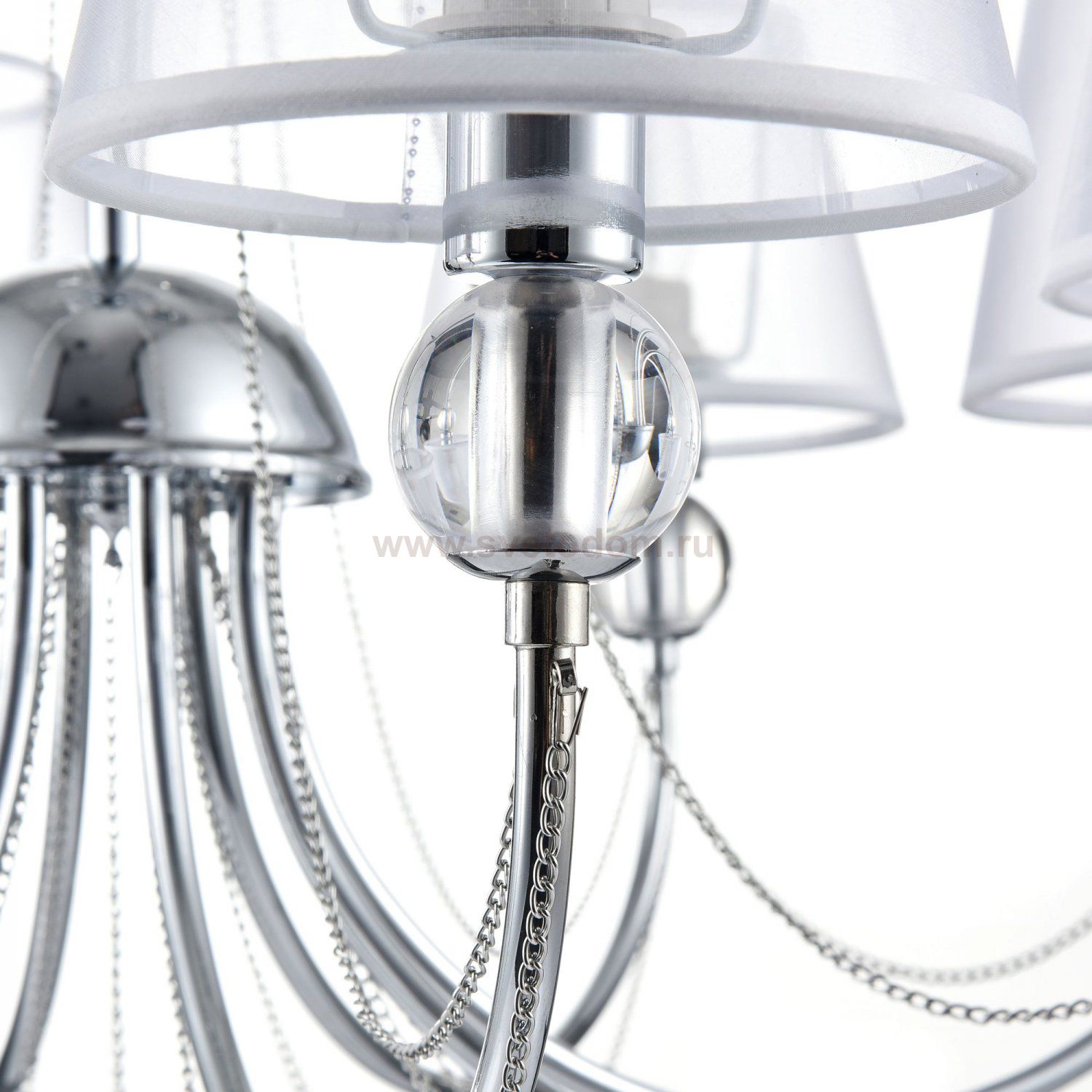 Светильники станут украшением интерьера, придадут ему шарм. Арматура светильников - из металла, а абажуры – из прозрачной органзы и ПВХ. Каждый из светильников серии дополнен тонкими серебристыми цепочками, а основания рожков украшены стеклянными прозрачными шарами. Завершающий элемент дизайна светильников Beverly – это декоративные подвески.