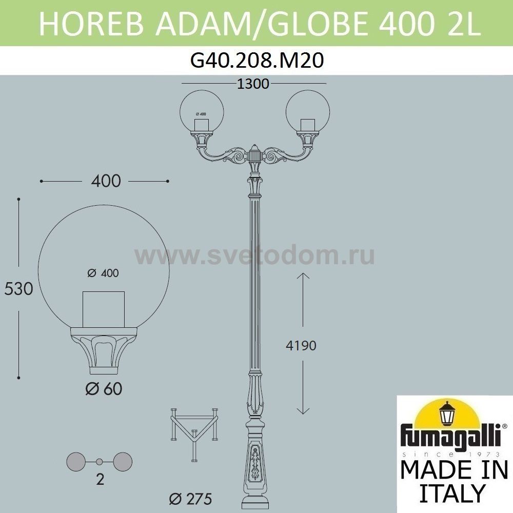 Касаемо артикула G40.208.M20.AYE27 важно знать - Парковый фонарь FUMAGALLI большого размера серии GLOBE 400, модель HOREB ADAM/GLOBE 400 2L. Парковый фонарь с 2 светильниками - шарами большого размера, на консолях ADAM большого размера, установленных на классическом столбе HOREB высотой 3,5 м +высота фонарей на кронштейнах). Изготовлен в Италии, по уникальным технологиям "FUMATECH" из современного композитного полимера RESIN. Этот материал в 5 раз прочнее силумина, не ржавеет, не окисляется, не выгорает на солнце, его не нужно красить. Все светильники пыле-влаго защищены по стандарту IP65 (Пыленепроницаемые, защита от водяных струй с любого направления). Рассеиватель выполнен из антивандального, не мутнеющего и не горючего PMMA (ПолиМетилМетаАкрилат). Срок службы светильника - не менее 20 лет. Температура использования от -60 до +90. В серии GLOBE 400 есть ландшафтные фонари в настенном (ADAM/GLOBE 400, ADAM/GLOBE 400) и наземном исполнении (HOREB/GLOBE 400, HOREB/GLOBE 400) со столбами разной высоты, с разным количеством и конфигурацией голов. Консоли настенных фонарей и кронштейны светильников на столбах освещения устанавливаются в положение "вверх" и "вниз". Столбы имеют в основе мощную стальную трубу с двойной оцинковкой и монтажный люк. Закладные элементы- в комплекте. При заказе требуется выбрать цвет корпуса и цвет плафона.