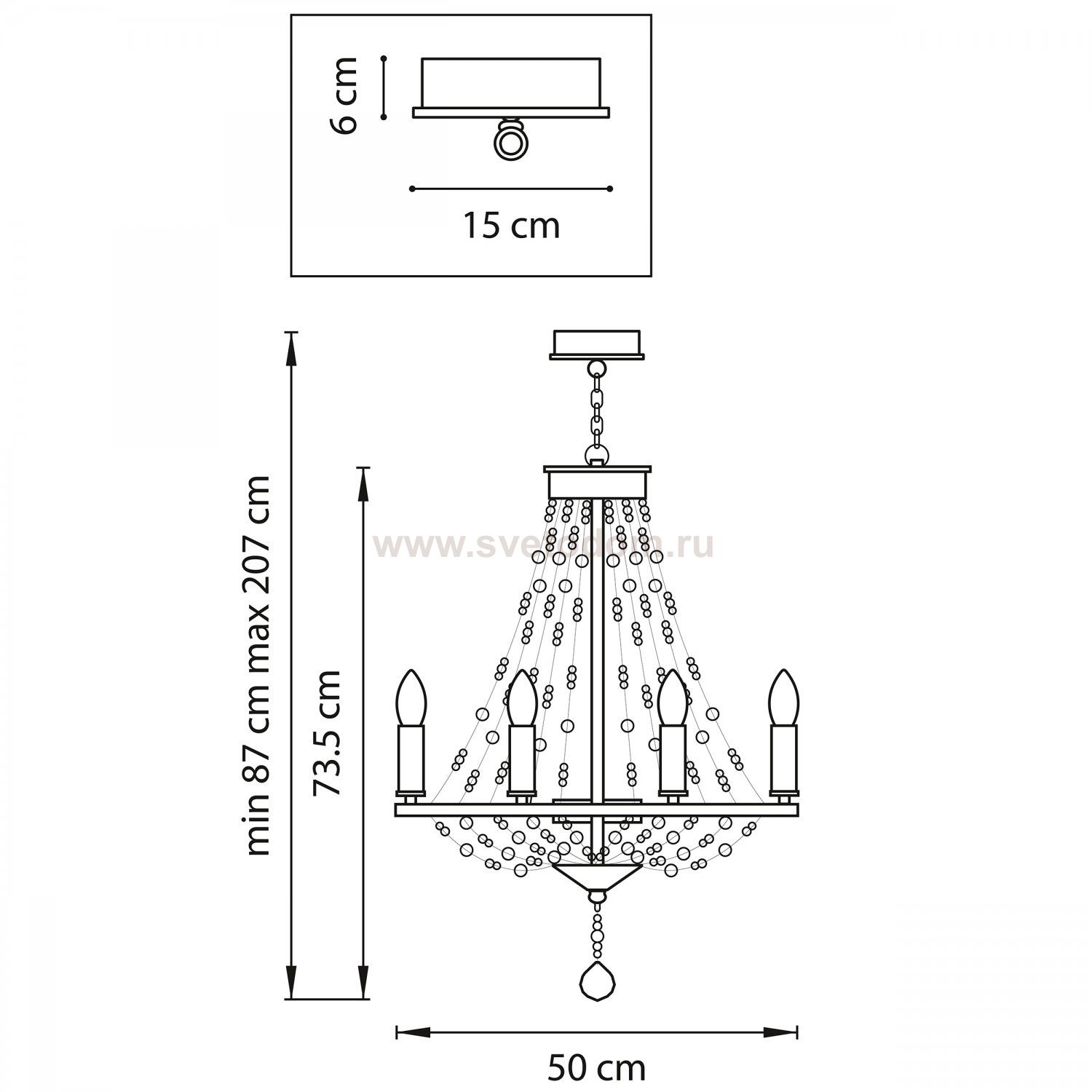 Высота min-max (см): 87-207; Ширина (см): 50; Вес (кг): 5,05; Кол-во ламп: 8xE14; Мощность max (W): 40; Цвет основания/цвет стекла или абажура: COOPER;