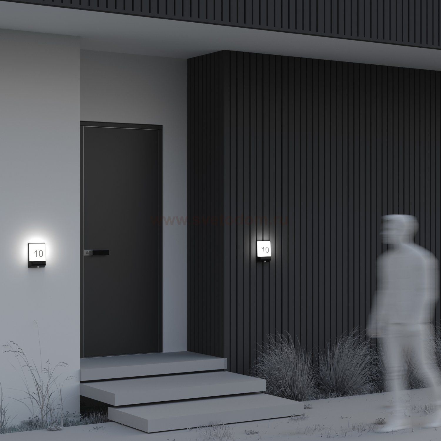 Материал корпуса - алюминий, цвет - графит. Оригинальный рассеиватель из белого матового стекла с возможностью наносить цифровые обозначения (номер дома и др.). Набор цифр в комплекте. LED-источник света, цветовая температура 3000К. Степень защиты - IP44.
