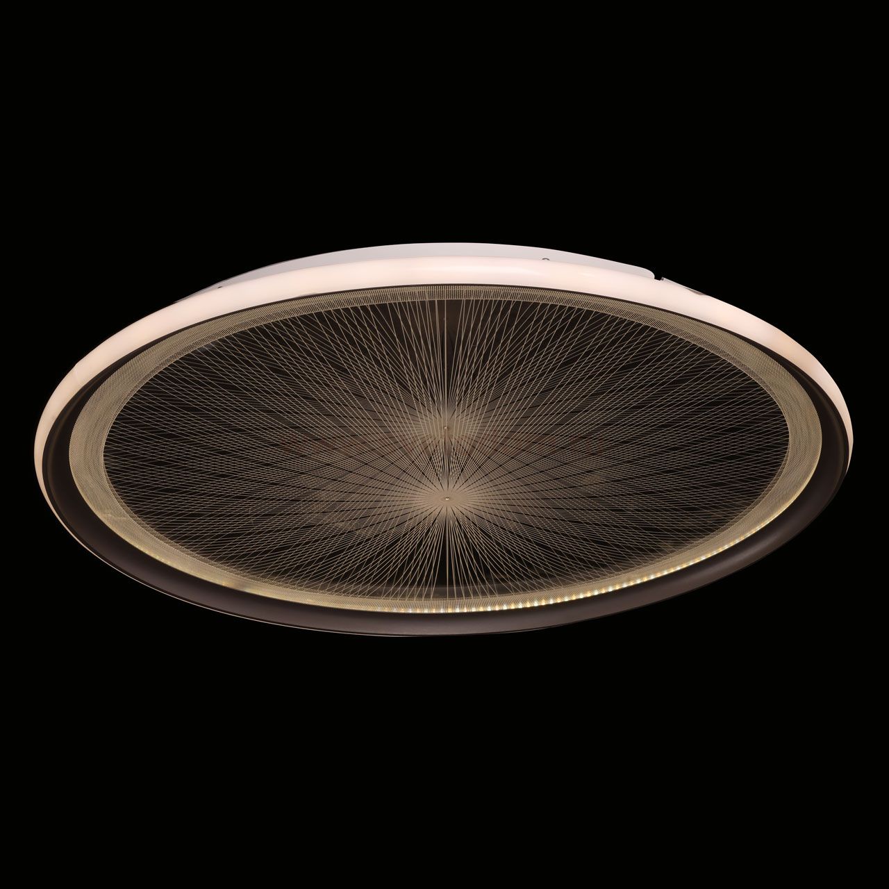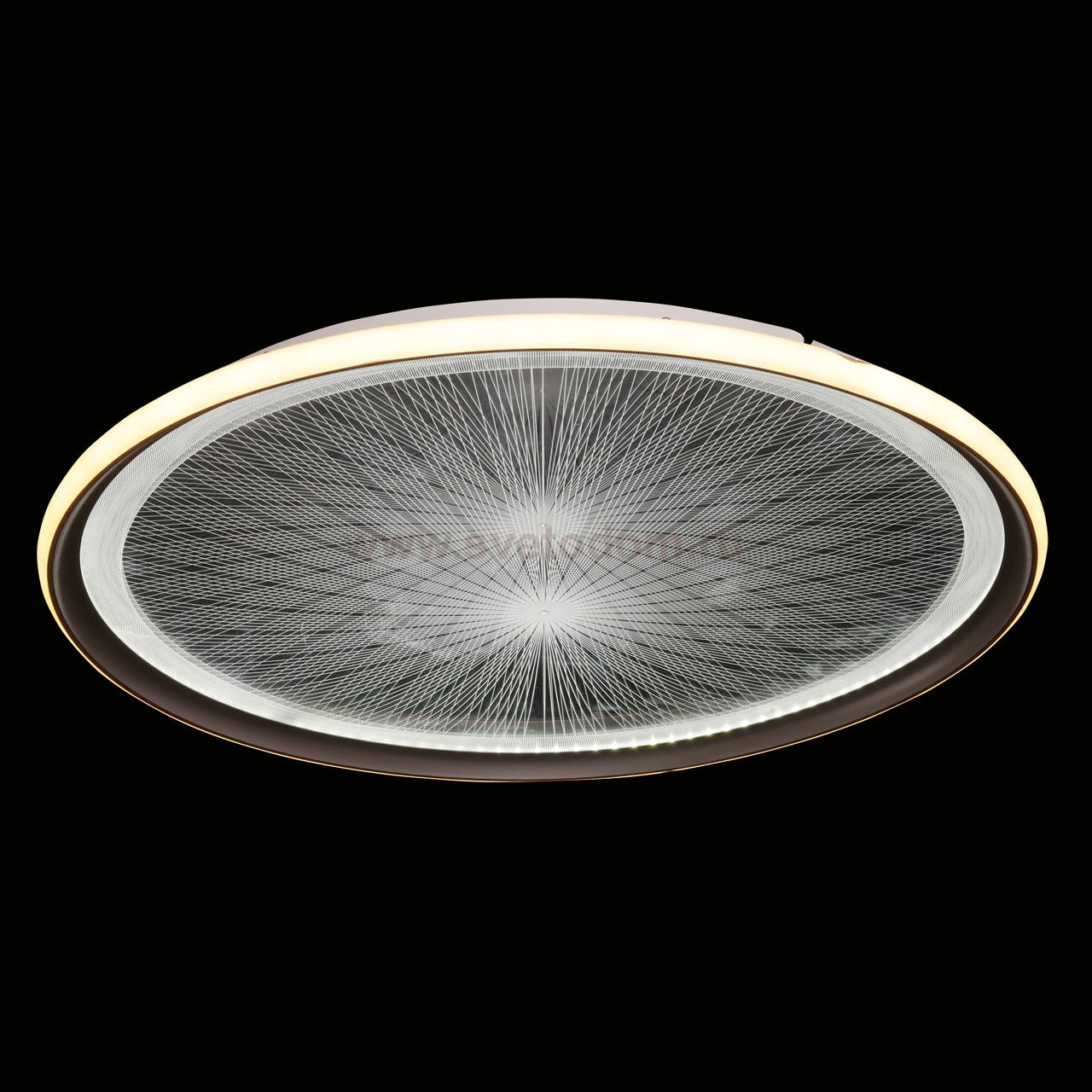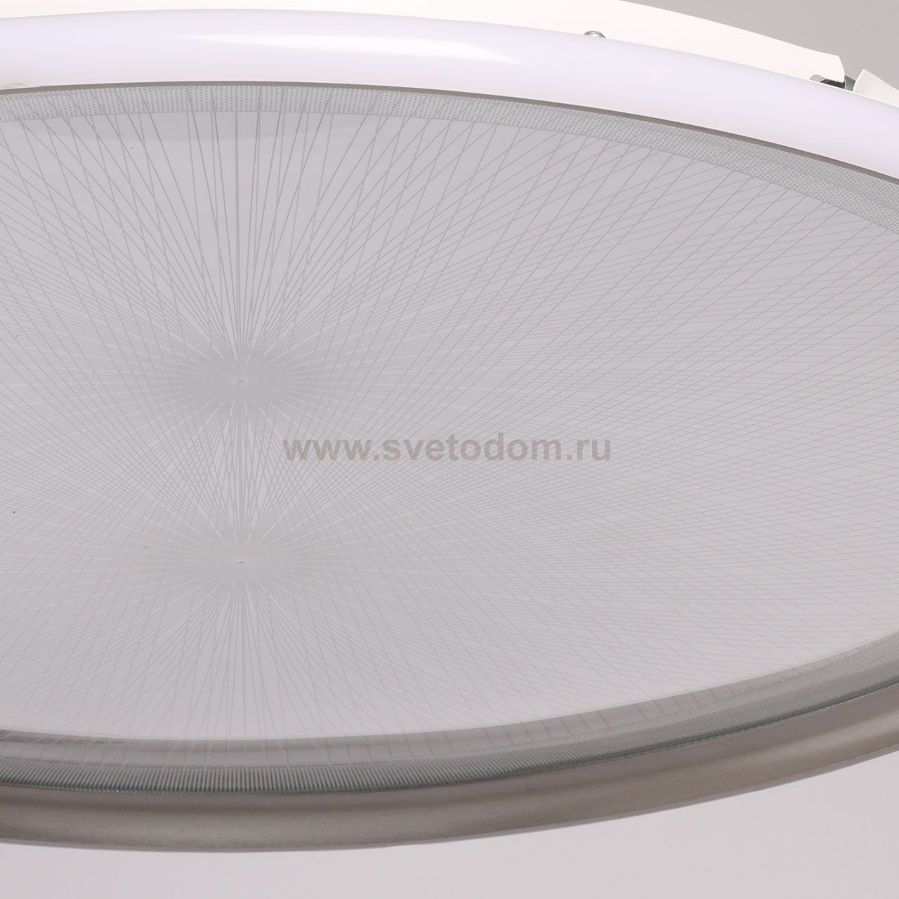 Металлическое основание потолочной люстры окрашено в белый цвет. Корпус плафона выполнен из сплава алюминия с цинком и окрашен в серебряный цвет. Изнутри плафон гальванизирован в цвет хрома. Светодиодные источники света закрыты прозрачным акрилом с 3D-эффектом. Светодиоды по периметру плафона закрыты белым матовым силиконом. Комментарий