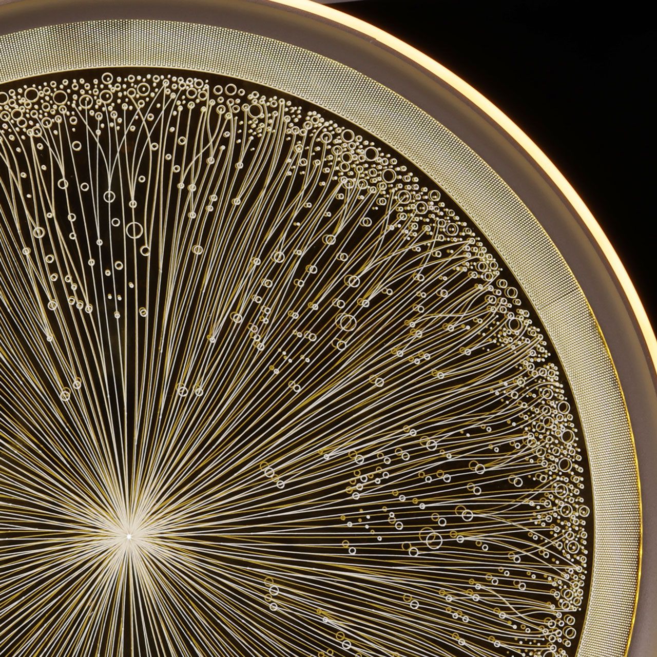 Металлическое основание потолочной люстры окрашено в белый цвет. Корпус плафона выполнен из сплава алюминия с цинком и окрашен в серебряный цвет. Изнутри плафон гальванизирован в цвет золота. Светодиодные источники света закрыты прозрачным акрилом с 3D-эффектом. Светодиоды по периметру плафона закрыты белым матовым силиконом. Комментарий