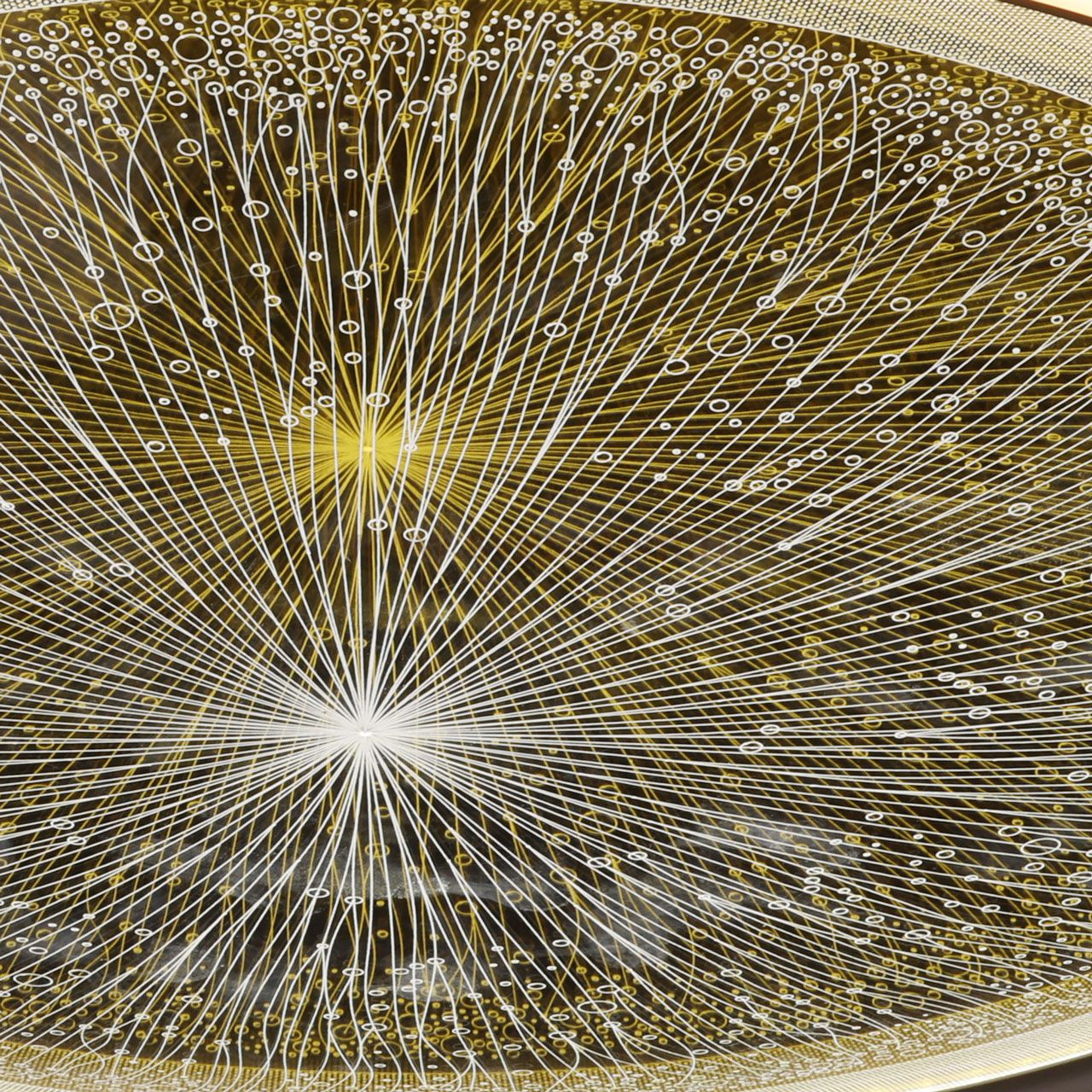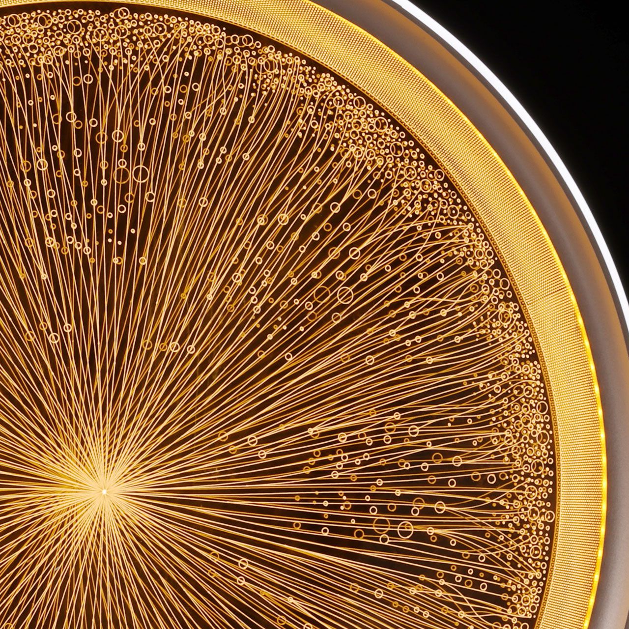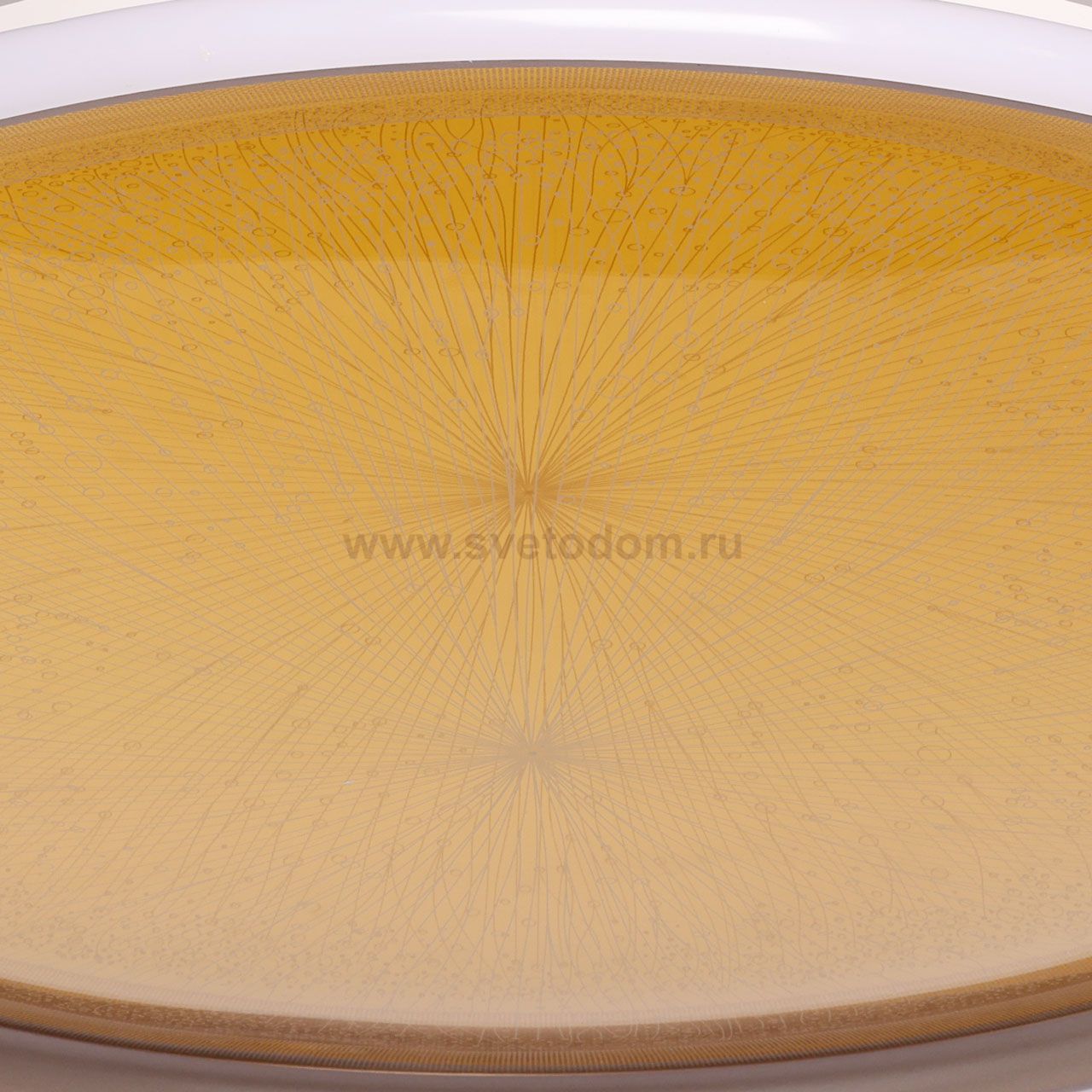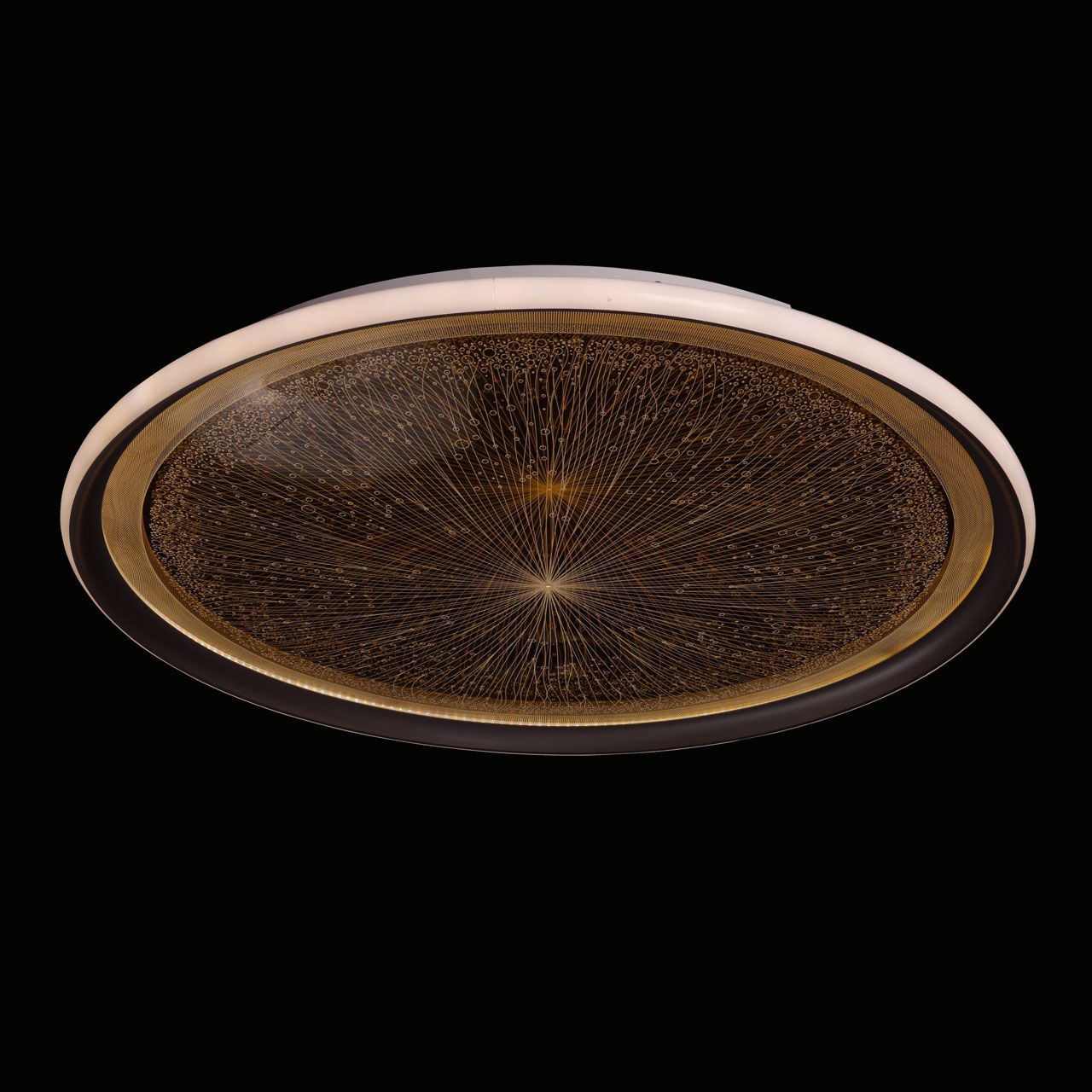 Металлическое основание потолочной люстры окрашено в белый цвет. Корпус плафона выполнен из сплава алюминия с цинком и окрашен в серебряный цвет. Изнутри плафон гальванизирован в цвет золота. Светодиодные источники света закрыты прозрачным акрилом с 3D-эффектом. Светодиоды по периметру плафона закрыты белым матовым силиконом. Комментарий