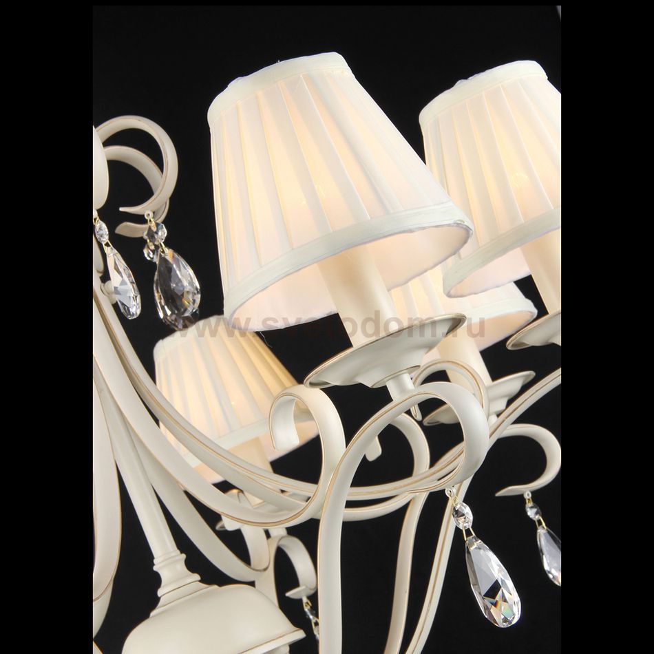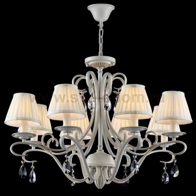 Материал арматуры — металл, цвет — бежевый. Белые абажуры из органзы изготовлены по технологии намотки. Декоративные подвески из прозрачных кристаллов. Регулируемая высота подвесных светильников. Источник света - лампа с цоколем Е14.