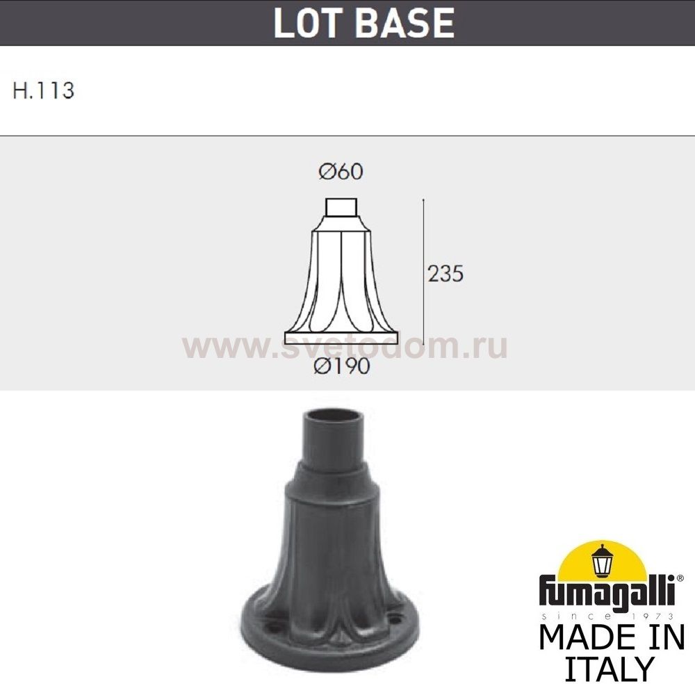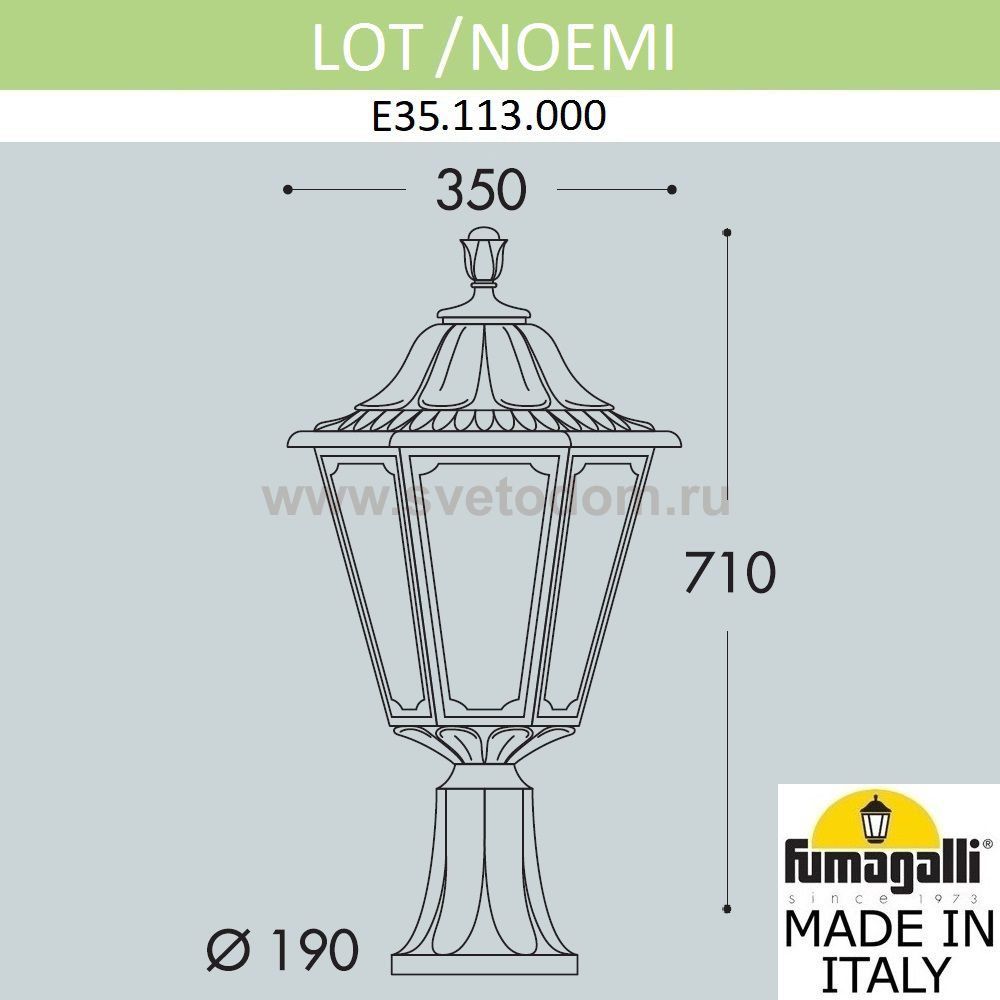 Касаемо артикула E35.113.000.WYH27 важно знать - Ландшафтный фонарь FUMAGALLI большого размера в пушкинском стиле серии NOEMI, модель LOT/NOEMI. Светильник большого размера на наземном креплении LOT применяется для освещения входных групп, пандусов, стилобатов, колонн, парапетов, и других архитектурных объектов где требуется уличное освещение. Устанавливается на горизонтальную поверхность, как правило на каком либо возвышении, для гармоничного интегрирования в интерьер или экстерьер проекта. Изготовлены в Италии, по уникальным технологиям "FUMATECH" из современного композитного полимера RESIN. Этот материал в 5 раз прочнее металла, не ржавеет, не окисляется, не выгорает на солнце, его не нужно красить. Все светильники пыле-влаго защищены по стандарту IP55 (Пылезащищенные, защита от водяных струй с любого направления). Рассеиватель выполнен из антивандального, не мутнеющего и не горючего PMMA (ПолиМетилМетаАкрилат). Срок службы светильника - не менее 20 лет. Температура использования от -60 до +90. В серии NOEMI есть садовые фонари в настенном (OFIR/NOEMI, MIRRA/NOEMI) подвесном (SICHEM/NOEMI) и наземном исполнении (IAFAET.R/NOEMI, ALOE.R/NOEMI, ARTU/NOEMI, GIGI/NOEMI, RICU/NOEMI, NEBO/OFIR/NOEMI 1L, NEBO/OFIR/ANNA 2L, TABOR/ADAM/NOEMI 3L) со столбами разной высоты, с разным количеством и конфигурацией голов. Консоли настенных фонарей и кронштейны светильников на столбах освещения могут устанавливаться в положение вверх и вниз. Столбы выше 150 см имеют в основе мощную стальную трубу с двойной оцинковкой. При заказе требуется выбрать цвет корпуса, цвет плафона и тип патрона (Е-27 или LED GX-53). Возможен светодиодный вариант. По стилю и дизайну серия уличных светильников NOEMI похожа на светильники среднего размера серии RUT и на светильники малого размера серии ANNA. По размеру относится к большим парковым светильникам как серия SIMON и GLOBE 400.
