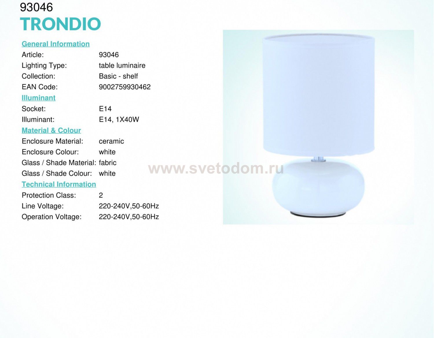 S-2310 Отзывы Настольная лампа Eglo 93046 TRONDIOПока нет отзывов об этом товаре, напишите и он обязательно появится после модерации! Оставить свой отзывПохожие товары Другие товары магазина Фото