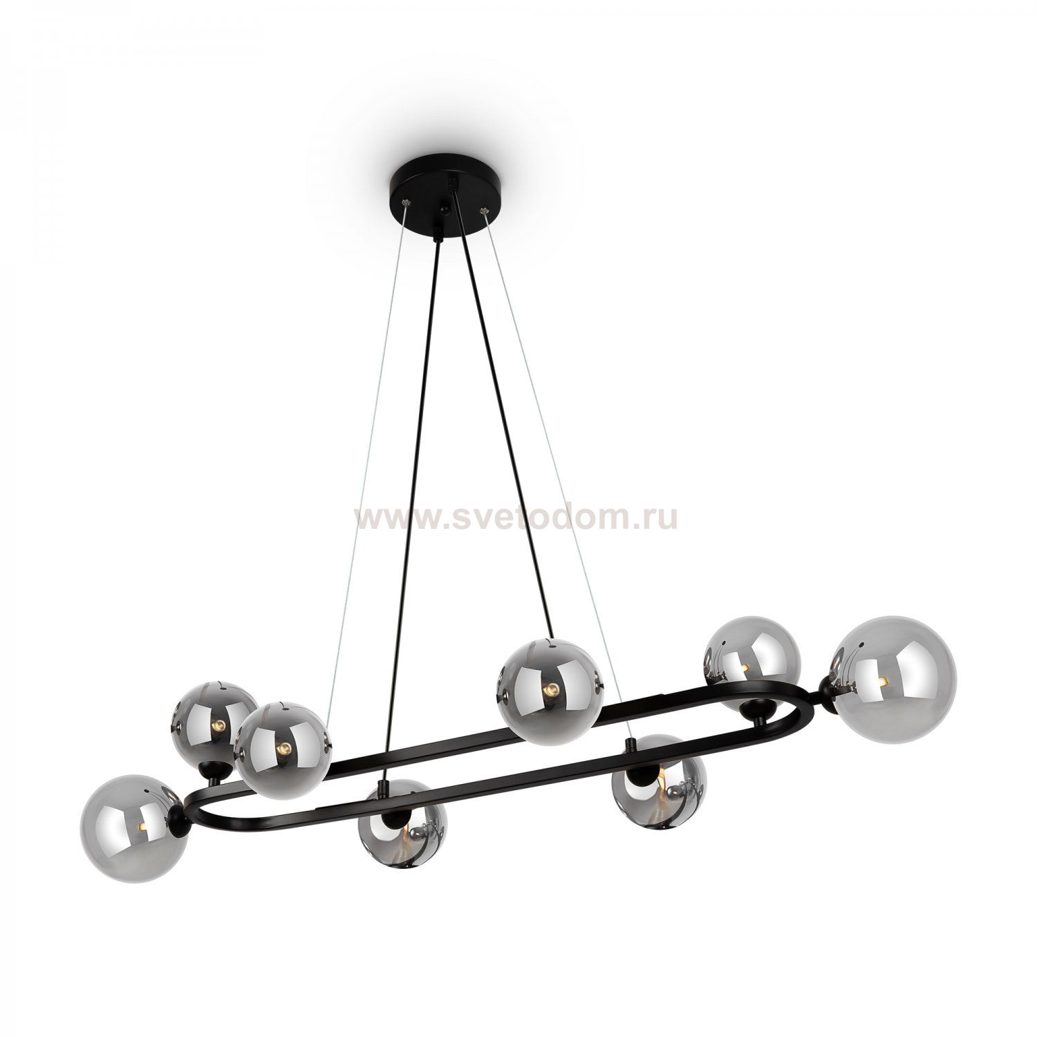 Металлическая арматура, цвета - черный и золотой. Плафоны-сферы из стекла 2х оттенков - матовый белый, полупрозрачный дымчатый - расположены на вытянутом металлическом каркасе, обеспечивая равномерный свет. Тонкие тросы придают светильнику эффект парения. Источник света - лампа с цоколем G9.
