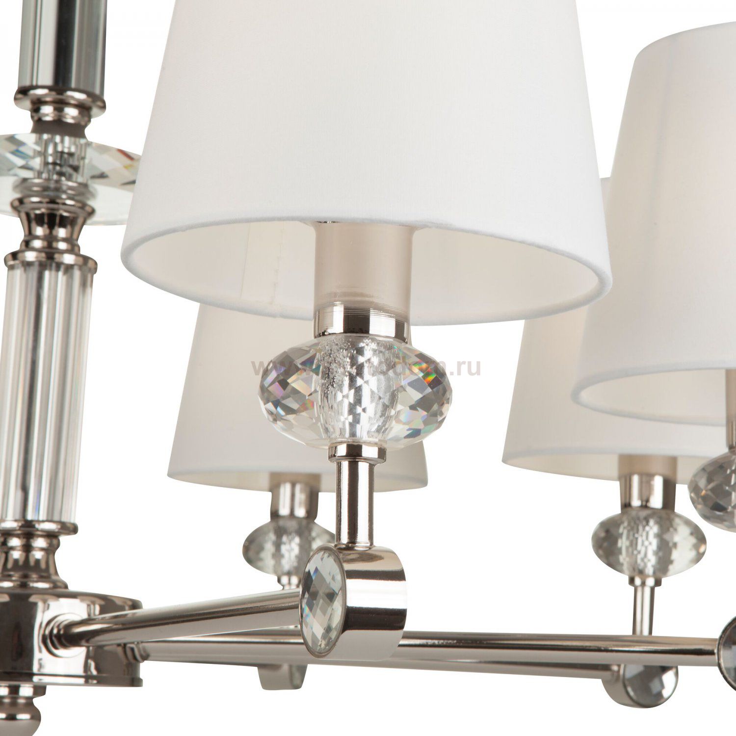 Материал арматуры – нержавеющая сталь, цвет – хром. Материал абажуров – текстиль на ПВХ, цвет – белый. Декор – прозрачное стекло. Акцентные стеклянные кристаллы на рожках со сложной огранкой.