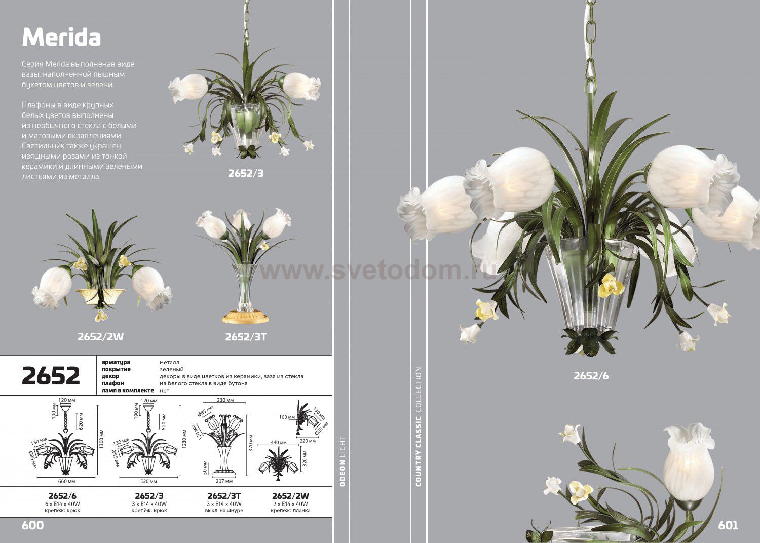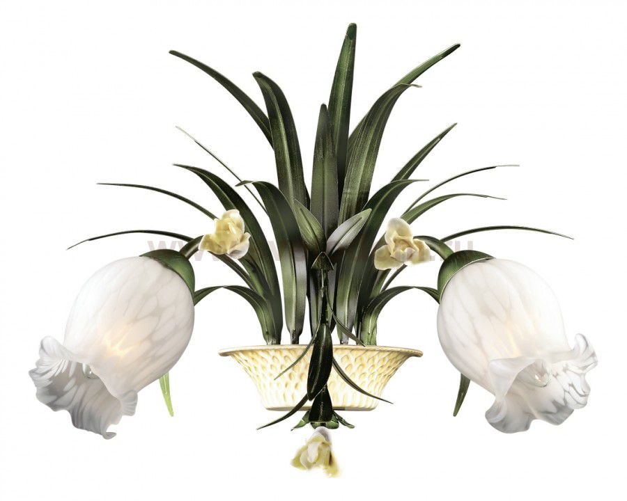 Бра 2652 / 2W линии Merida выполнено в виде невысокого кашпо, наполненного пышным букетом цветов и зелени. Плафоны в виде крупных белых цветов выполнены из необычного стекла с белыми и матовыми вкраплениями. Светильник также украшен изящными розами из тонкой керамики и длинными зелеными листьями из металла. Цоколь E14. Мощность 2*40W. Нет ламп в комплекте.