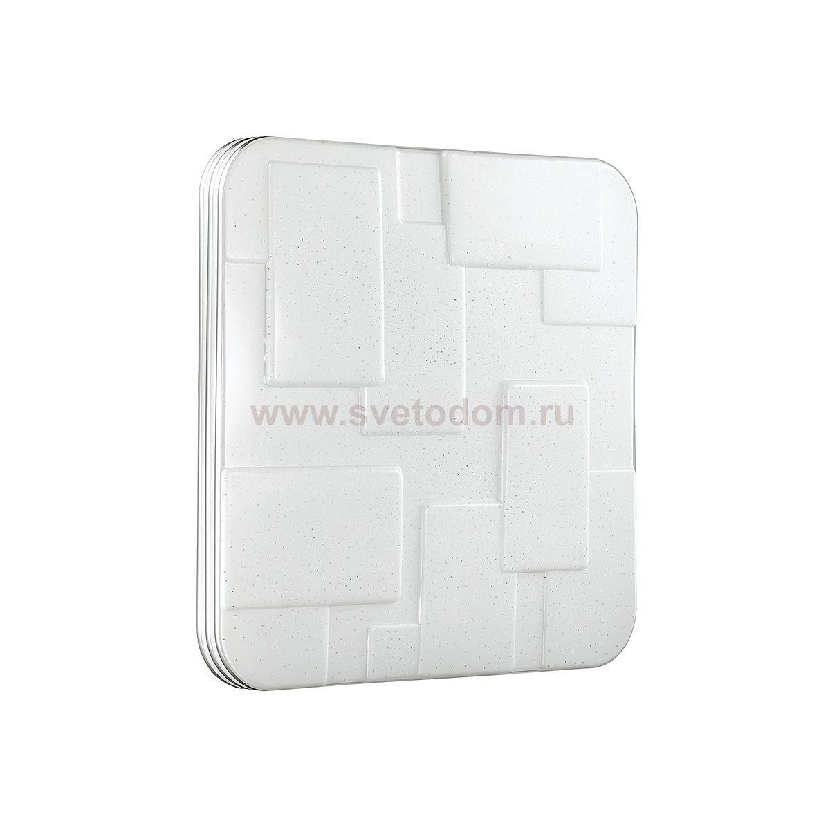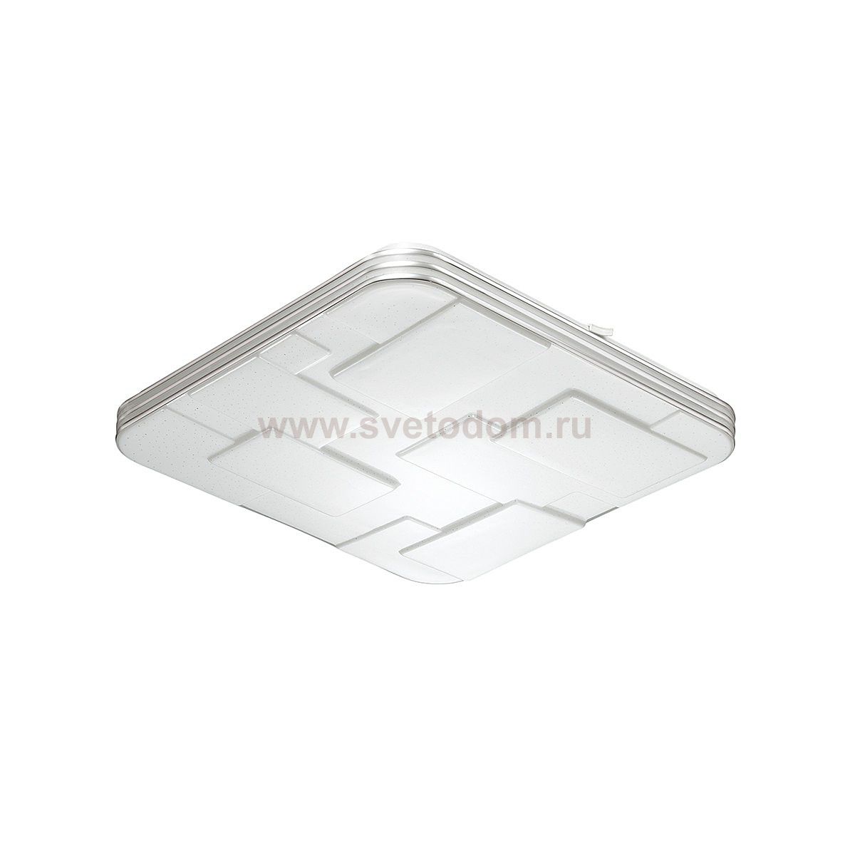 Светильник 2085/DL линии NORES состоит из металлического основания (базы) и пластикового рассеивателя. Материал рассеивателя - высококачественный акрил белого матового цвета, обеспечивающий светильнику равномерное рассеивание и хорошее светопропускание. Форма плафона: квадратная, в виде рельефного орнамента с геометрическим рисунком, декорирован прозрачными точками, придающими включенному светильнику красивый эффект "звездного мерцания" и переливания. Степень защиты IP43 позволяет использовать светильник в определенных зонах влажных помещений. В комплект входит заменяемый LED модуль с линзами, мощностью 48Вт, которая соответствует лампе накаливания 350Вт. А также пульт ДУ, с помощью которого осуществляется плавное изменение цветовой температуры 3000-6000К, изменение яркости, переход в режим переключения теплого//белого/холодного/ночного света. Светильник имеет функцию "память".