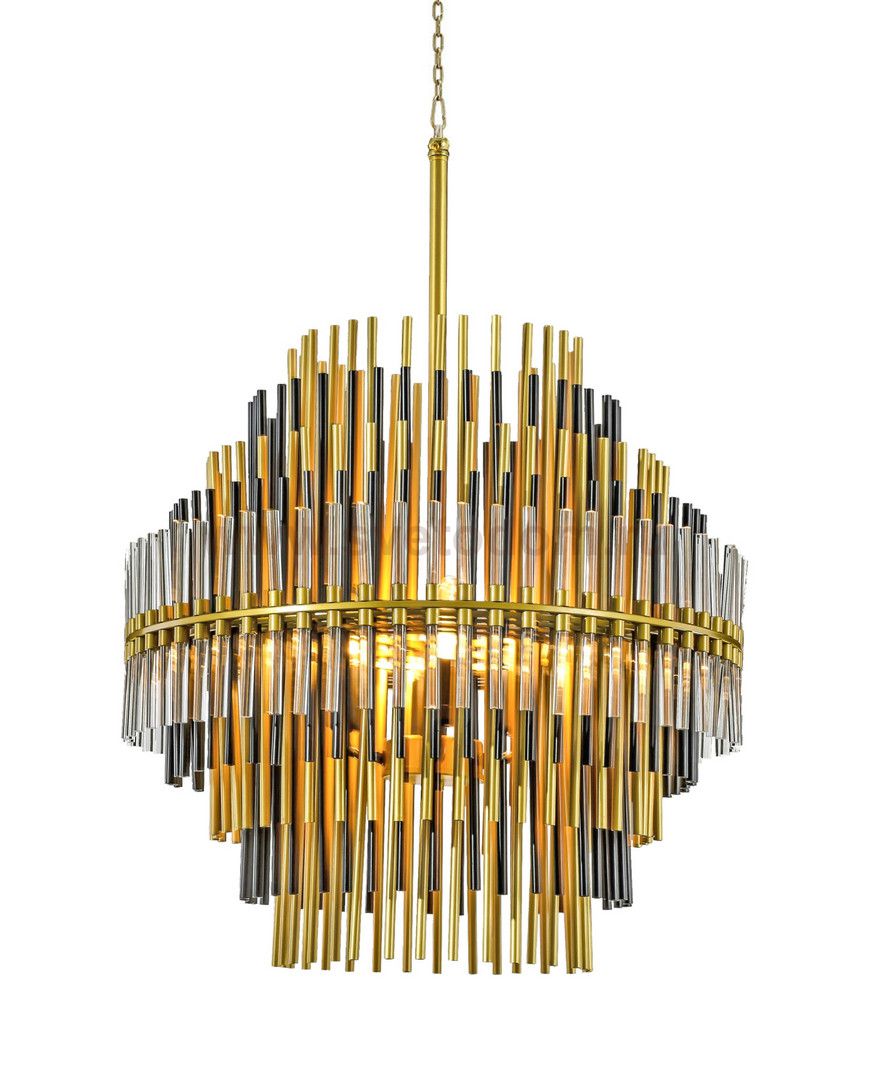 Люстра Emile Round шарообразной формы, на основе металла и стекла. Состоит из множества мелких трубок серебристого, золотого и черного цвета, которые соединяются друг с другом и образуют яруса с плавным переходами между ними.