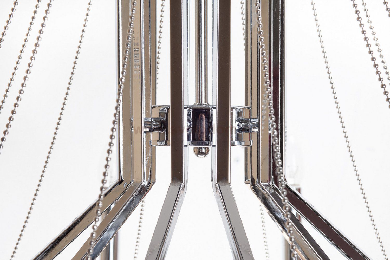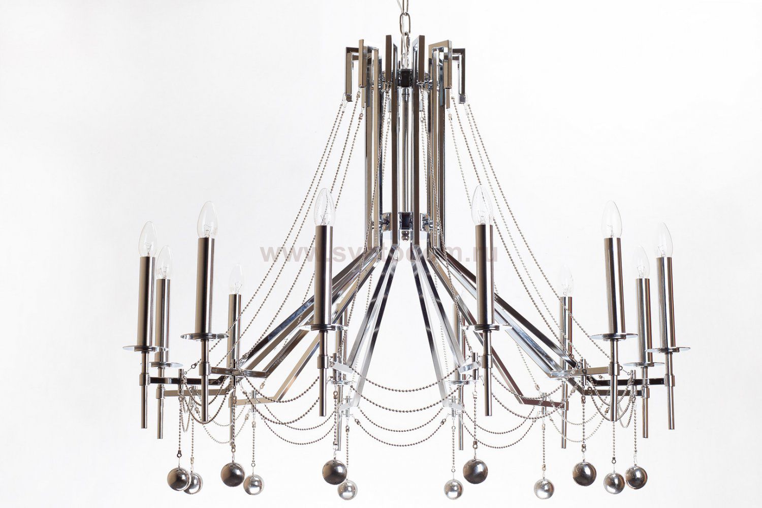 Люстра Rocco Silver 12 сложной конструкции из стилизованного под серебро металла. Состоит из множества изящных элементов разных форм. От верхнего основания модели отходят тонкие стержни с квадратным сечением, которые, дважды изогнувшись под углом 135 градусов, переходят в держатели для ламп. Цоколь в форме свечи оснащен продолговатой лампочкой, имитирующей огонь в зажженном состоянии. В качестве дополнительного декора используются вертикально расположенные трубки, круглые металлические шарики, свисающие с конструкции, и тонкие цепочки, проходящие сверху вниз и охватывающие изделие по бокам.