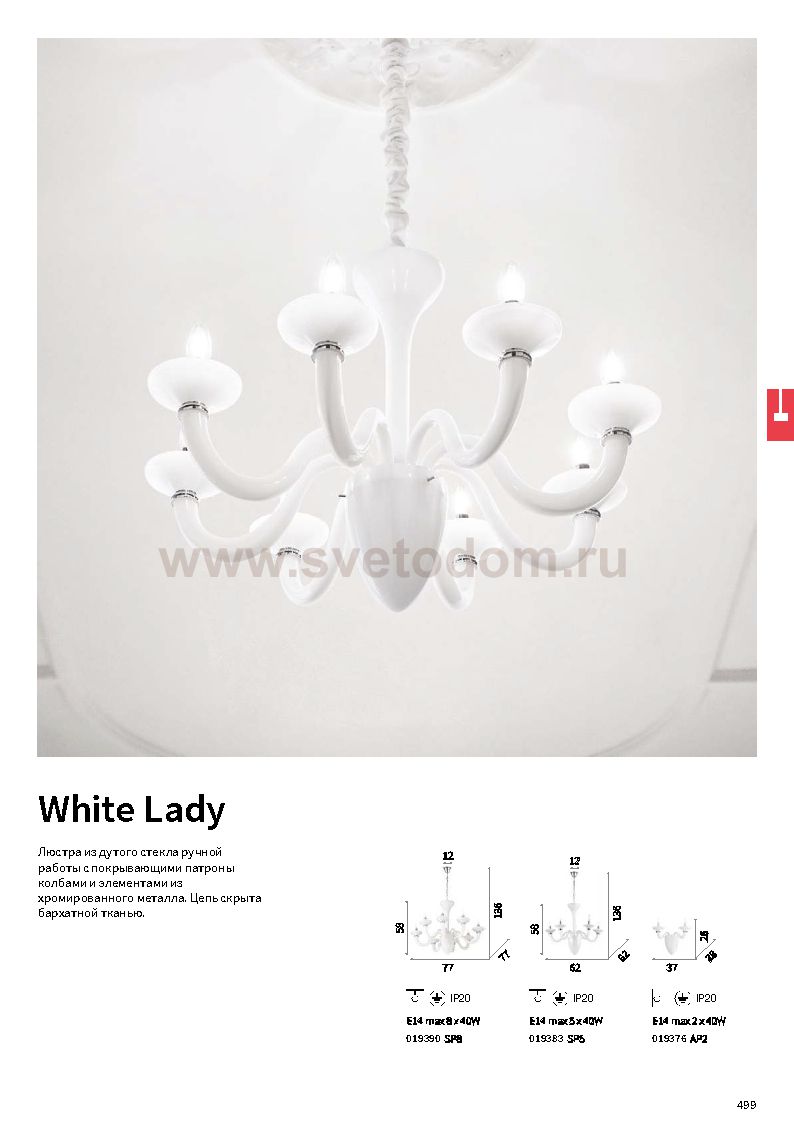 Подвесной светильник от известной итальянской фабрики Ideal lux из каталога Classico в венецианском стиле под артикулом WHITE LADY SP8 (19390) серии WHITE LADY имеет ряд отличительных характеристик: Люстра из дутого стекла ручной работы с покрывающими патроны колбами и элементами из хромированного металла. Цепь скрыта бархатной тканью.