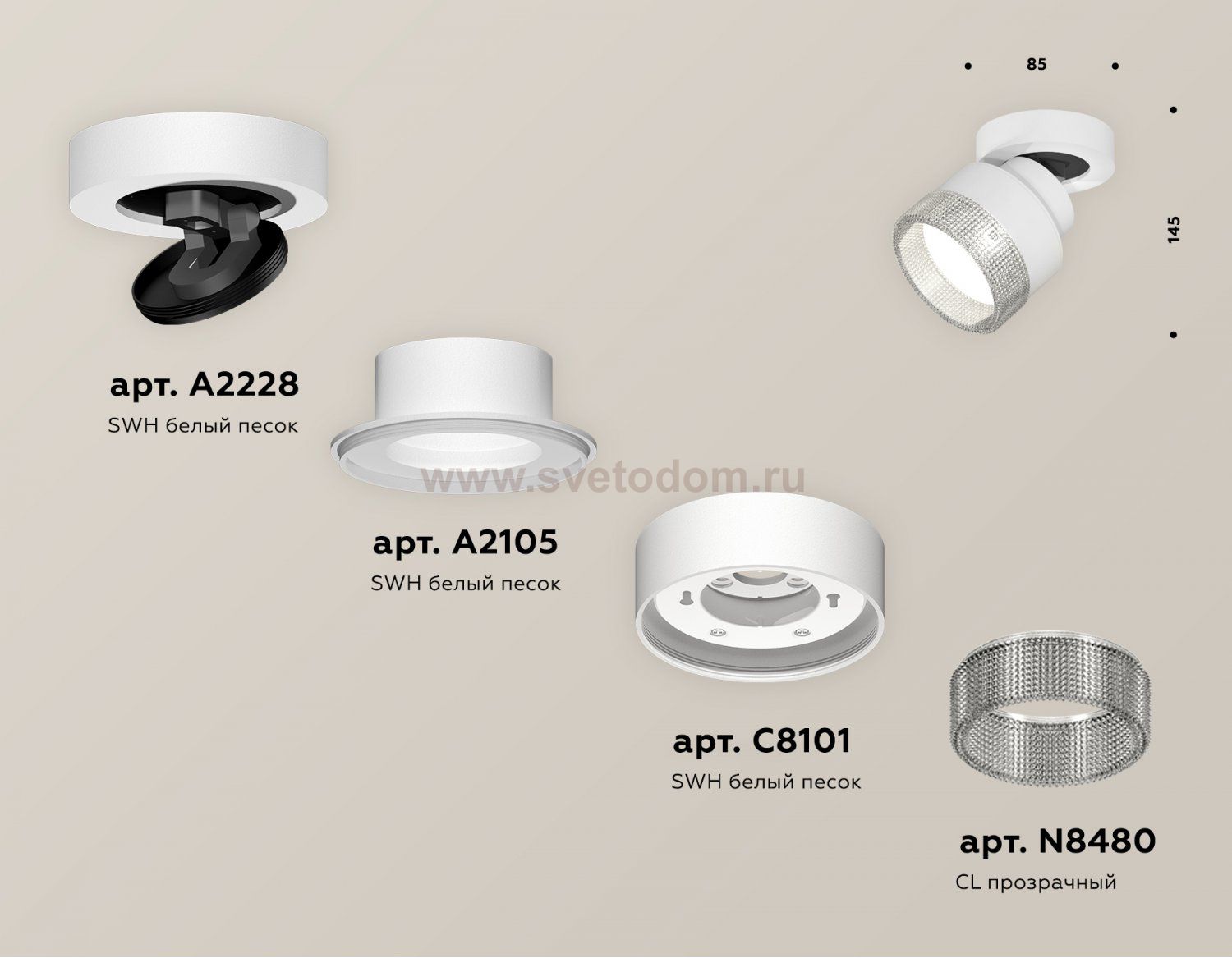 крепеж накладной поворотный D60, коннектор D60/D85, корпус накладной D85, насадка передняя D85 Отзывы Комплект накладного поворотного светильника с композитным хрусталем Ambrella XM8101040 XMПока нет отзывов об этом товаре, напишите и он обязательно появится после модерации! Оставить свой отзывПохожие товары Другие товары магазина Фото
