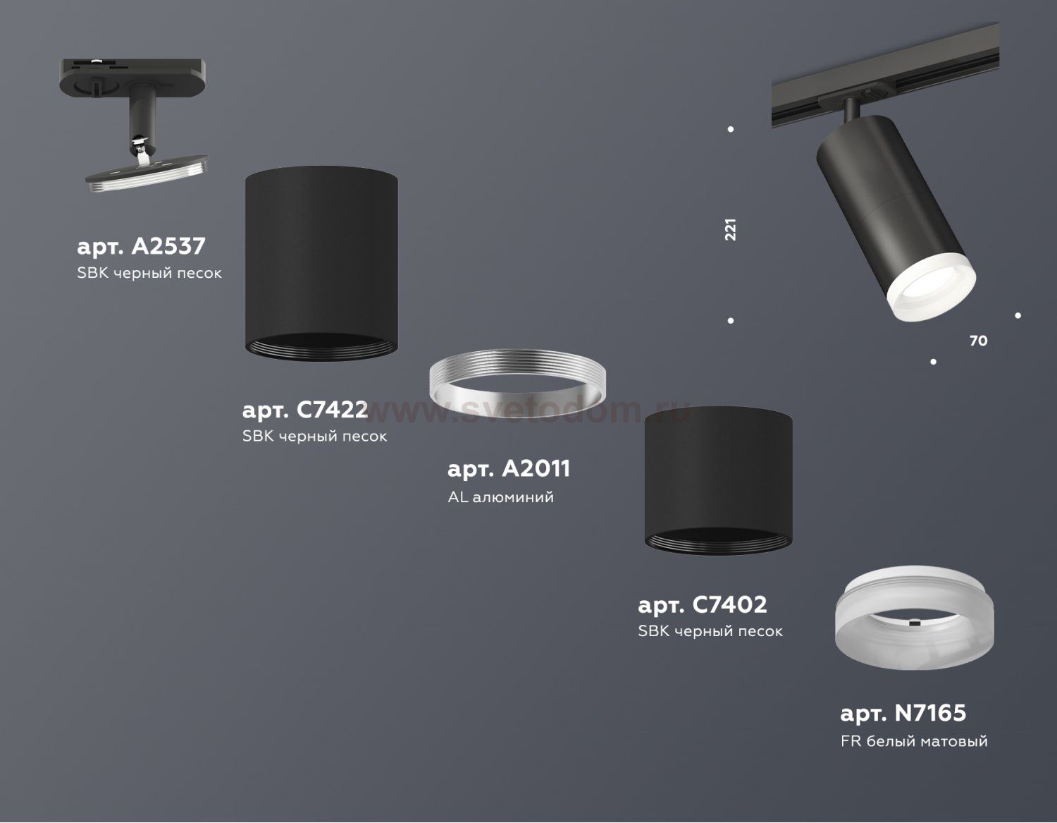 крепеж трековый D70, корпус накладной D70*2шт, коннектор скрытый D70, насадка передняя D70 Отзывы Комплект трекового светильника с акрилом Ambrella XT7402111 XTПока нет отзывов об этом товаре, напишите и он обязательно появится после модерации! Оставить свой отзывДругие товары магазина Фото