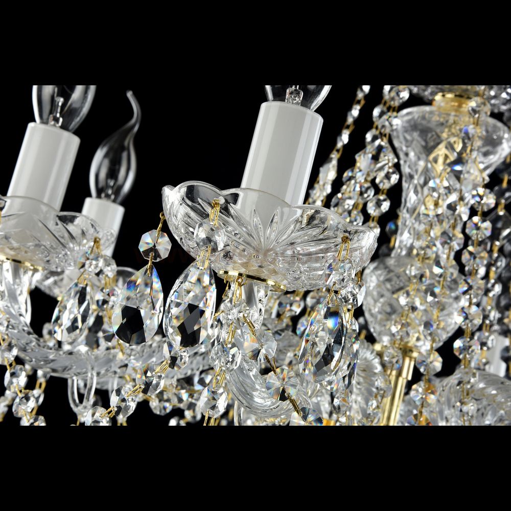 Металлическая арматура золотого цвета. Рожки – витое прозрачное стекло. Рельефный стеклянный декор обрамляет контуры светильника. Подвески из крис таллов различных форм и огранки.