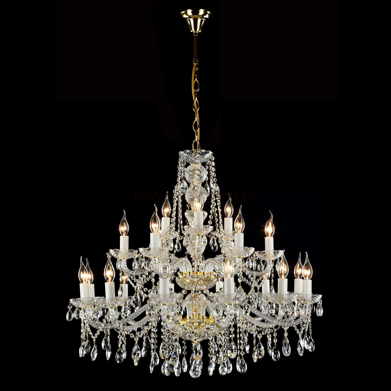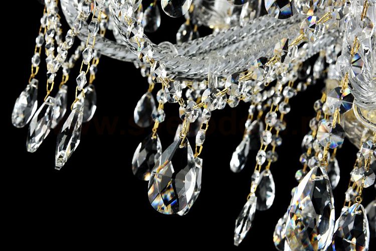 Металлическая арматура золотого цвета. Рожки – витое прозрачное стекло. Рельефный стеклянный декор обрамляет контуры светильника. Подвески из крис таллов различных форм и огранки.
