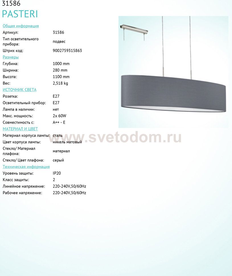 Подвесной светильник – это универсальный вариант, подходящий для любой комнаты. Сегодня производители предлагают огромный выбор таких моделей по самым разным ценам. В каталоге интернет-магазина «Светодом» мы собрали большое количество интересных и оригинальных светильников по выгодной стоимости. Вы можете приобрести их в Москве, Екатеринбурге и любом другом городе России. Подвесной светильник Eglo 31586 сразу же привлечет внимание Ваших гостей благодаря стильному исполнению. Благородный дизайн позволит использовать эту модель практически в любом интерьере. Она обеспечит достаточно света и при этом легко монтируется. Чтобы купить подвесной светильник Eglo 31586, воспользуйтесь формой на нашем сайте или позвоните менеджерам интернет-магазина.