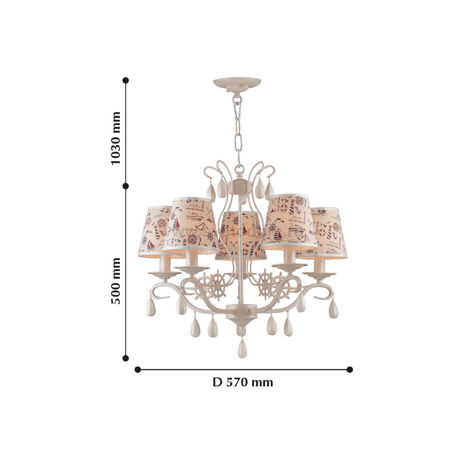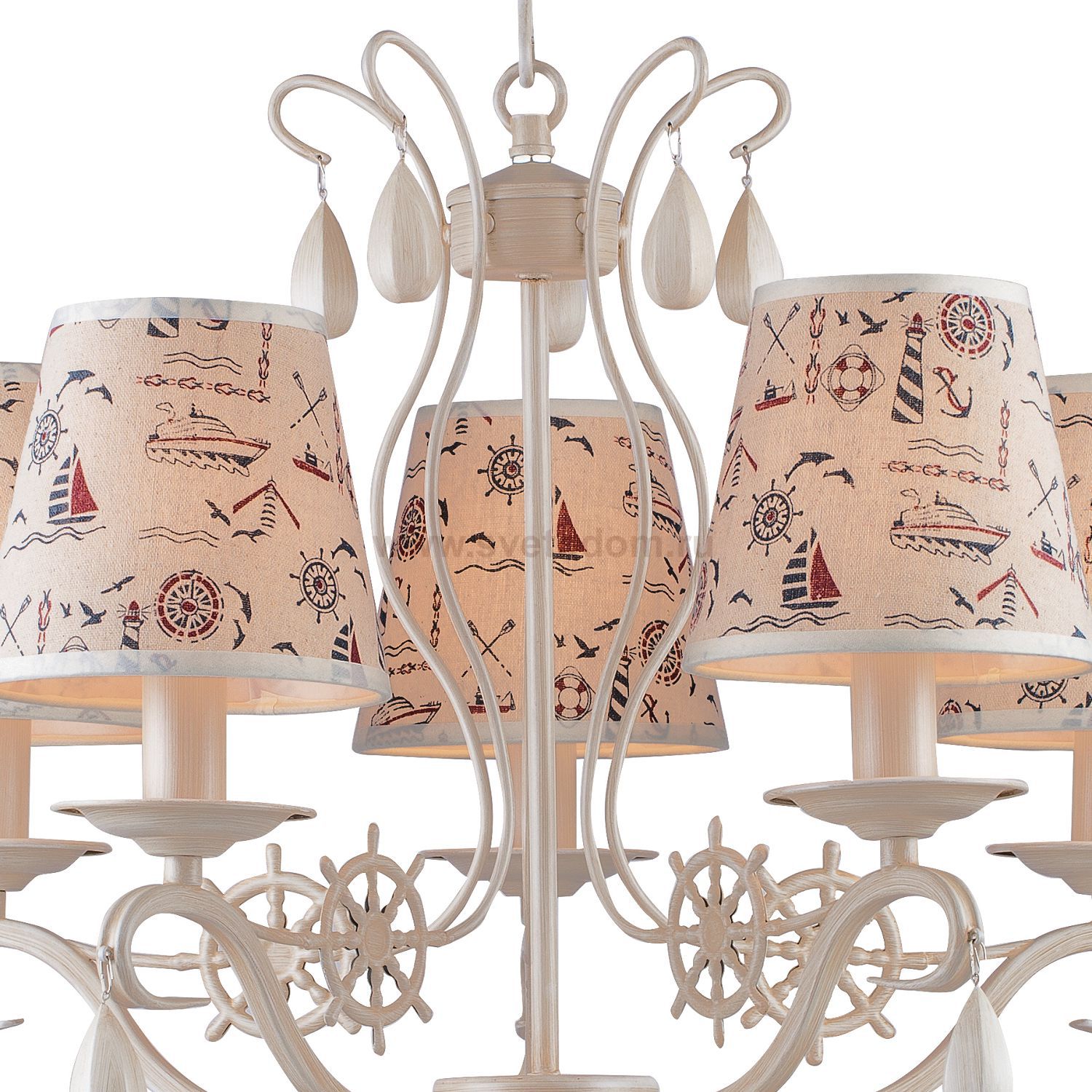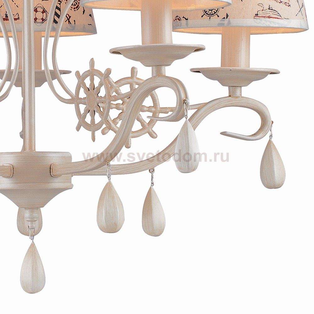 Арматура светильников окрашена в бежевый цвет, абажуры выполнены их хлопковой ткани с принтом. Материал плафона