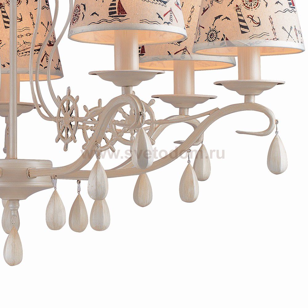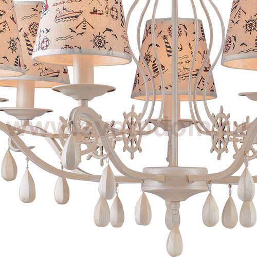 Арматура светильников окрашена в бежевый цвет, абажуры выполнены их хлопковой ткани с принтом. Материал плафона