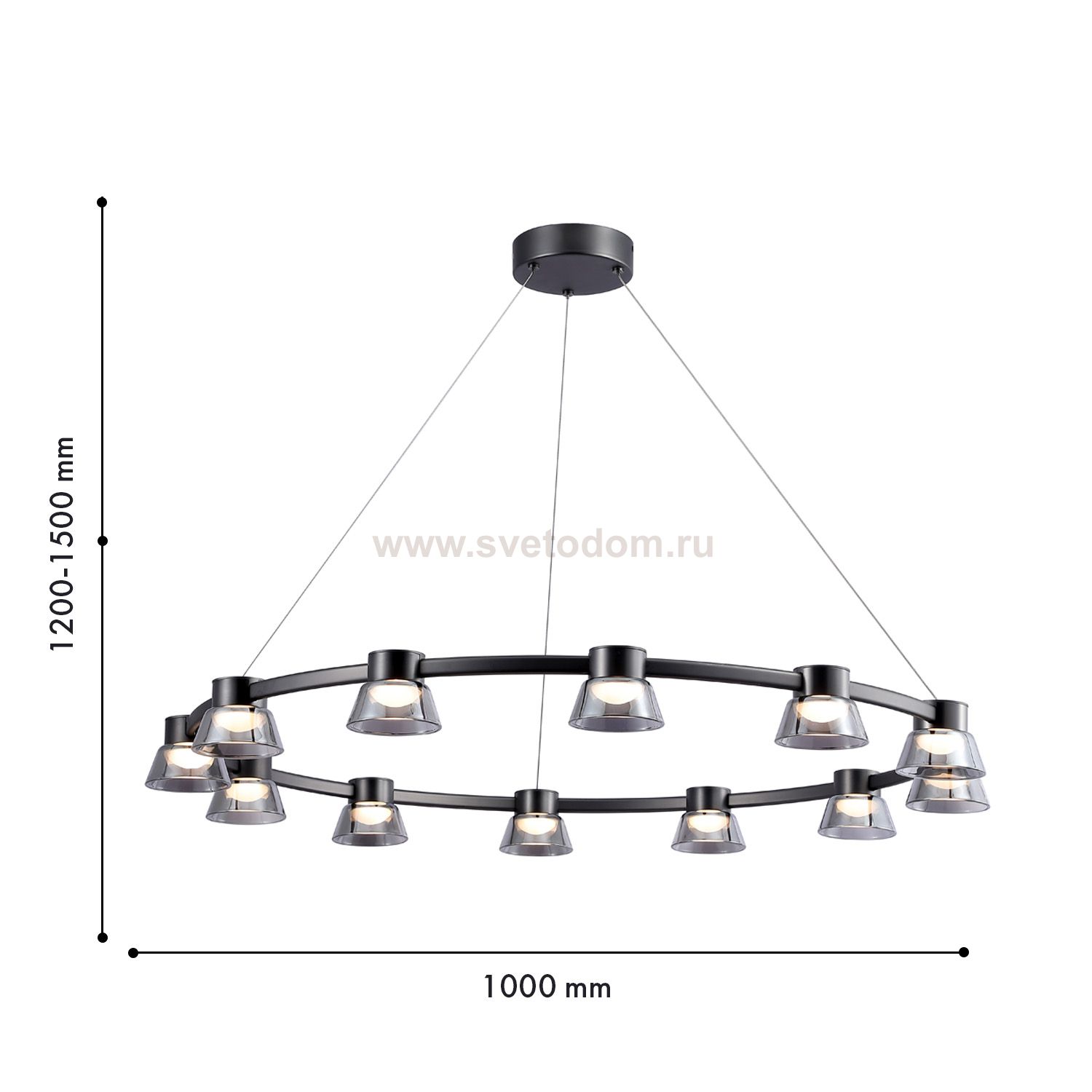 Подвесная люстра диаметром 100 см с прозрачными рифлеными плафонами, каждый из которых состоит из двух слегка выгнутых стекол, закрепленных на заклепк Серия