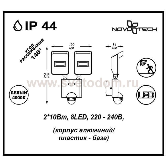 Декоративный светодиодный уличный настенный светильник с инфракрасным датчиком движения модели Novotech 357220 из серии TITAN отличается следующим качеством: Корпус светильника состоит из алюминия. Это металл, основными достоинствами которого являются — устойчивость к практически всем видам негативного воздействия окружающей среды, коррозии, небольшой вес, по сравнению с другими видами металла и экологическая безопасность материала. База – пластик. Этот материал имеет высокие эксплуатационные показатели, что объясняется его повышенной стойкостью к механическим повреждениям и защищенностью от факторов внешней среды. Экономичность (КПД порядка 90%), отсутствие токсичных элементов (не наносят вред здоровью, не требуют специальной утилизации), отсутствие ультрафиолетового излучения, пожаробезопасность (не нагреваются), морозостойкость, ударопрочность и устойчивость к вибрациям. Срок службы светодиодов до 25000 часов. Диапазон рабочих температур от -20 до +50 градусов Цельсия.