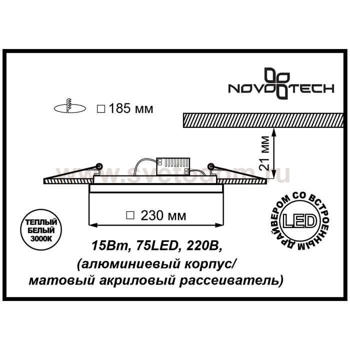 Встраиваемый светодиодный светильник со встроенным драйвером модели Novotech 357277 из серии PEILI отличается следующим качеством: Корпус светильника произведен из алюминия. Это металл, основными достоинствами которого являются — устойчивость к практически всем видам негативного воздействия окружающей среды, коррозии. Небольшой вес, по сравнению с другими видами металла и экологическая безопасность материала. Рассеиватель сделан из акрила. Основными свойствами которого являются: высокая светопропускаемость — 92 %, которая не изменяется с течением времени, сохраняя свой оригинальный цвет, сопротивляемость удару в 5 раз больше, чем у стекла, устойчивость к воздействию влаги, бактерий и микроорганизмов, морозостойкость и экологичность. Срок службы светодиодов до 25000 часов.