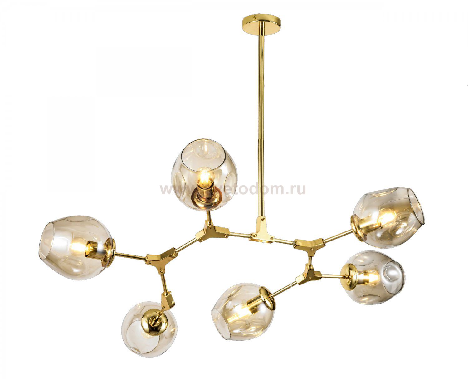 Прозрачные плафоны с круглым отверстием в верхней части выполнены в виде слегка вытянутой сферы. Модель содержит 6 ламп и весит менее трех килограммов и подходит для потолков любого типа.